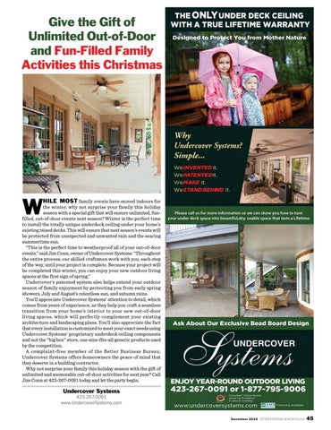 the winter, why not surprise your family this holiday season with a special gift that will ensure unlimited, funfilled, out-of-door events next season? Winter is the perfect time to install the totally unique underdeck ceiling under your home’s existing raised decks. This will ensure that next season’s events will be protected from unexpected and unwanted rain and the searing summertime sun. “This is the perfect time to weatherproof all of your out-of-door events,” said Jim Conn, owner of Undercover Systems. “Throughout the entire process, our skilled craftsmen work with you, each step of the way, until your project is complete. Because your project will be completed this winter, you can enjoy your new outdoor living spaces at the first sign of spring.” Undercover’s patented system also helps extend your outdoor season of family enjoyment by protecting you from early spring showers, July and August’s relentless sun, and autumn rains. You’ll appreciate Undercover Systems’ attention to detail, which comes from years of experience, as they help you craft a seamless transition from your home’s interior to your new out-of-door living spaces, which will perfectly complement your existing architecture and landscaping plans. You’ll also appreciate the fact that every installation is customized to meet your exact needs using Undercover Systems’ proprietary underdeck ceiling components and not the “big box” store, one-size-fits-all generic products used by the competition. A complaint-free member of the Better Business Bureau, Undercover Systems offers homeowners the peace of mind that they deserve in a building contractor. Why not surprise your family this holiday season with the gift of unlimited and memorable out-of-door activities for next year? Call Jim Conn at 423-267-0091 today and let the party begin.