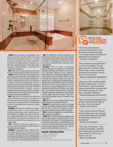 “Your sales representatives answered all my questions and promptly returned all my calls. Your installers did an incredible job. My kitchen looks gorgeous!” – Daniela S. (4/18/2017) “Your salesperson was professional, courteous, and helpful. We also appreciate your installers calling ahead, being on time, and leaving our home neat and clean. We love the color of our granite.” – Wayne & Josephine B. (12/20/2017) “All your installers worked straight through, keeping us up-to-date on their progress. I appreciate them using protective floor coverings and their attention to the care of our home. Beautiful! Fabulous!” – Doug & Cathryne H. (12/14/2017) “We are very pleased and appreciate all that Granite Transformations has done. You’ve been great!” – Judy H. (10/16/2017) “From our first contract with your business about a year ago, everyone we have dealt with was very helpful, knowledgeable, efficient, and professional.” – Marilyn G. (4/24/2017) “Your sales rep was great – very courteous and helpful. Installers were professional, courteous, and clean. Great job. We are very pleased. Love it!” – Mary N. (3/16/2017) January 2011 EVERYTHING KNOXVILLE Februar y 2018 EVERYTHING KNOXVILLE