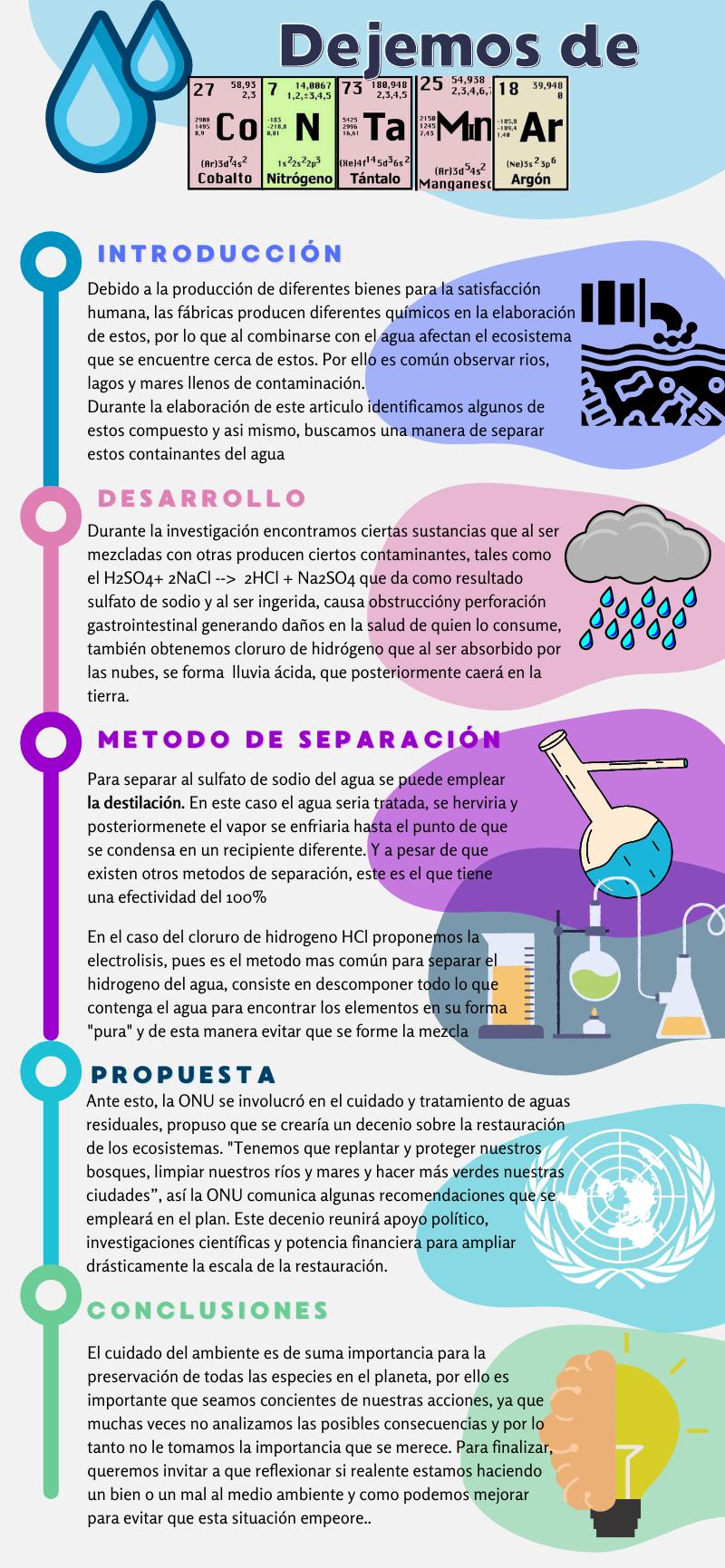 Dentro de la materia de Química, a lo largo del semestre logramos identificar algunos compuestos que llegan a ser bastante contaminantes con el medio y que al contacto con el agua pueden llegar a ser corrosivos y generan la perdida de muchos ecosistemas acuáticos, por lo que en la infografía se aborda un método de separación, así como, propuestas que nos pueden ayudar para cuidar y proteger nuestros mantos acuíferos.