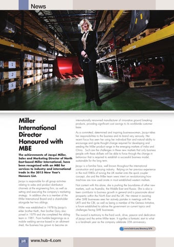 internationally renowned manufacturer of innovative ground breaking products, providing significant cost savings to its worldwide customer base. As a committed, determined and inspiring businesswoman, Jacqui takes her responsibilities to the business and its brand very seriously. Her recent focus has seen her using her individual flair and natural ability to encourage and ignite thought change required for developing and seeding the Miller product range in the emerging markets of India and China. Such are the challenges in these new markets that only business people with these skillsets will be able to force through the change in behaviour that is required to establish a successful business model, sustainable for the long term. Jacqui is a familiar face, well known throughout the international construction and quarrying industry. Relying on her previous experience in the mid-1980s of turning the UK market onto the quick coupler concept, she and the Miller team were intent on revolutionising how machines are now used onsite in most established western markets. Not content with this alone, she is pushing the boundaries of other new markets, such as Australia, the Middle East and Russia. She is also a keen contributor to business growth in general and is passionate about prosperity within the North East and the UK. Her interest in assisting other SME businesses sees her actively partake in meetings with the UKTI and the CBI, as well as being a member of the Genesis Initiative, a forum established to advise the government on current topics and challenges facing SME businesses. The award is testimony to the hard work, drive, passion and dedication of Jacqui and the entire Miller team. It signifies a fantastic start to what is a landmark year as the company celebrate 35th anniversary. www.hub-4.com/directory/570