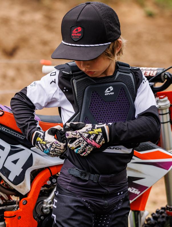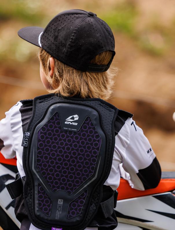 The new EVS Evolution Youth Chest Protector delivers advanced impact protection in a slim, lightweight design made to move with young riders. Built with RE ZRO®—a breathable, flexible, and high-performance impact material—it features CE EN 1621-3 Level 1 chest and CE EN 1621-2 Level 1 back protection. The lowprofile chassis fits close to the body for all-day comfort under a jersey, making it ideal for motocross, off-road, and multi-discipline riding. Big protection. Youth-ready fit.
