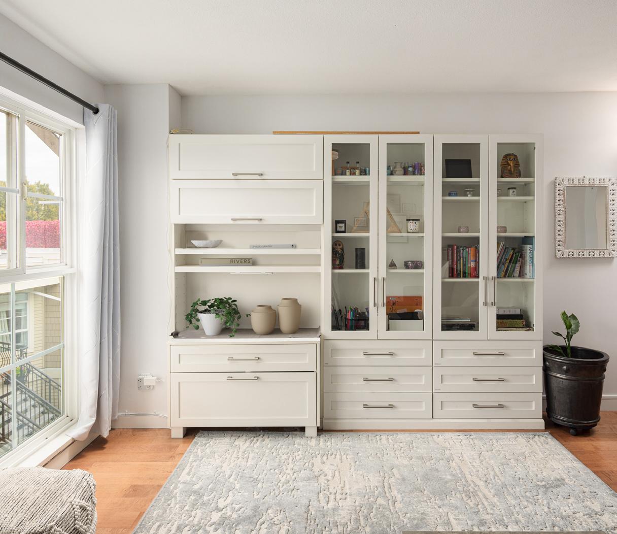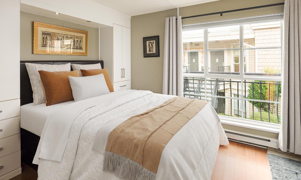 Welcome to Liberté, a hidden gem in the heart of Fairview. This two-level, 2-bedroom, 2-bathroom townhouse offers beautiful mountain and downtown skyline views, perfectly paired with the privacy and comfort of your own front door and no one living above you. Tucked quietly just off W 7th, this home feels like a true retreat in the city. The reverse floor plan features both bedrooms on the main level, including a primary suite with custom storage and walk-in closet plus a versatile second bedroom with a Murphy bed, ideal for guests or a flexible workspace.Upstairs, the bright open-concept living and dining area is framed by large windows and a cozy gas fireplace. Custom cabinetry adds warmth and function, while the refreshed kitchen seamlessly connects to a sunny, south-facing outdoor patio, perfect for morning coffee or evening BBQs.Modern updates throughout include engineered hardwood floors, reimagined bathrooms, designer lighting, and thoughtful built-ins for additional storage. This home comes complete with two secure parking stalls, a storage locker, and a pet and rental friendly strata community known for its friendly neighbours and pride of ownership.Set within one of Vancouver’s most walkable pockets, Liberté offers unbeatable access to the Seawall, Cambie Corridor, Broadway shops and restaurants, and the Olympic Village SkyTrain Station. A true blend of lifestyle, comfort, and location, this is Fairview living at its best.