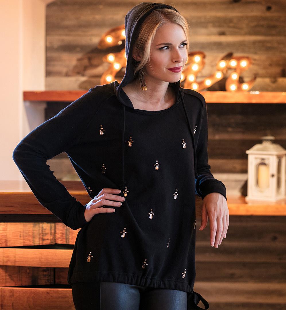 The Wallis is back, and comfier than ever! Our holiday pullover is crystal embellished, and made of a super soft 100% French Terry fabric. Only this time, the body length of the pullover is 2” longer and has a new adjustable hem with a grosgrain ribbon. An adjustable hem allows for a customizable fit! The front and back panel of the pullover is the ‘right’ side and the sleeves and the hood are the ‘reverse’ side, to give this pullover a unique edge. A black pullover with tonal charcoal stones should be a requirement for the casual chic wardrobe.