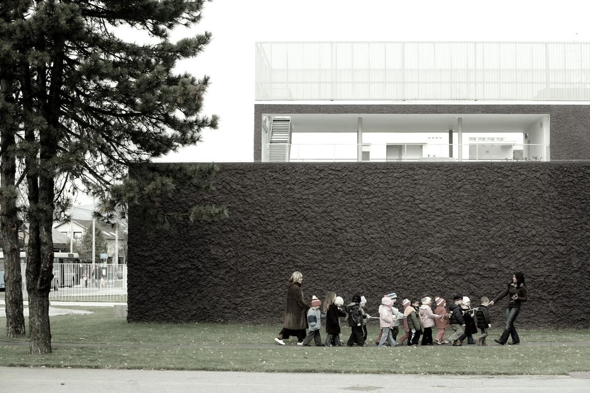 The kindergarten is initially conceived as a single-story mat building – compact, introverted, autocatalytic, with clearly defined borders. Due to the context, the mat is pushed away from the shadow and folded up towards the sun.