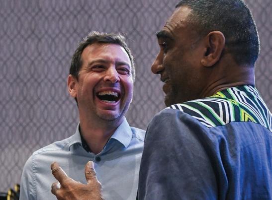 EWB-USA CEO Boris Martin and world-renowned climate activist Kumi Naidoo share a laugh between speeches.