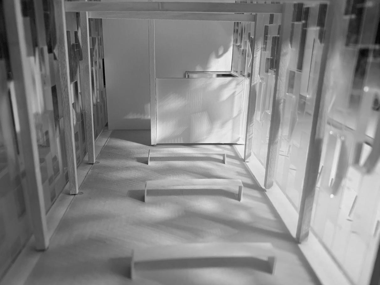juxtaposition between dark, light, and the ‘in-between’ are achieved through the implementation of folded elements, overhead conditions, slits in planes, screening, and frosted plexiglass to alter the way that light passes into and through the spaces. The circulation is also carefully thought out, guiding an occupant through the entirety of the intervention, which allows them to experience these varying qualities of light.