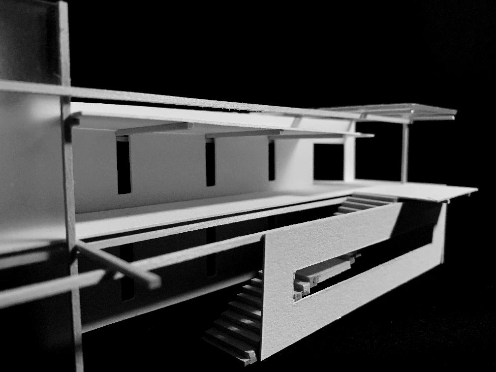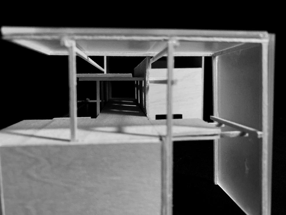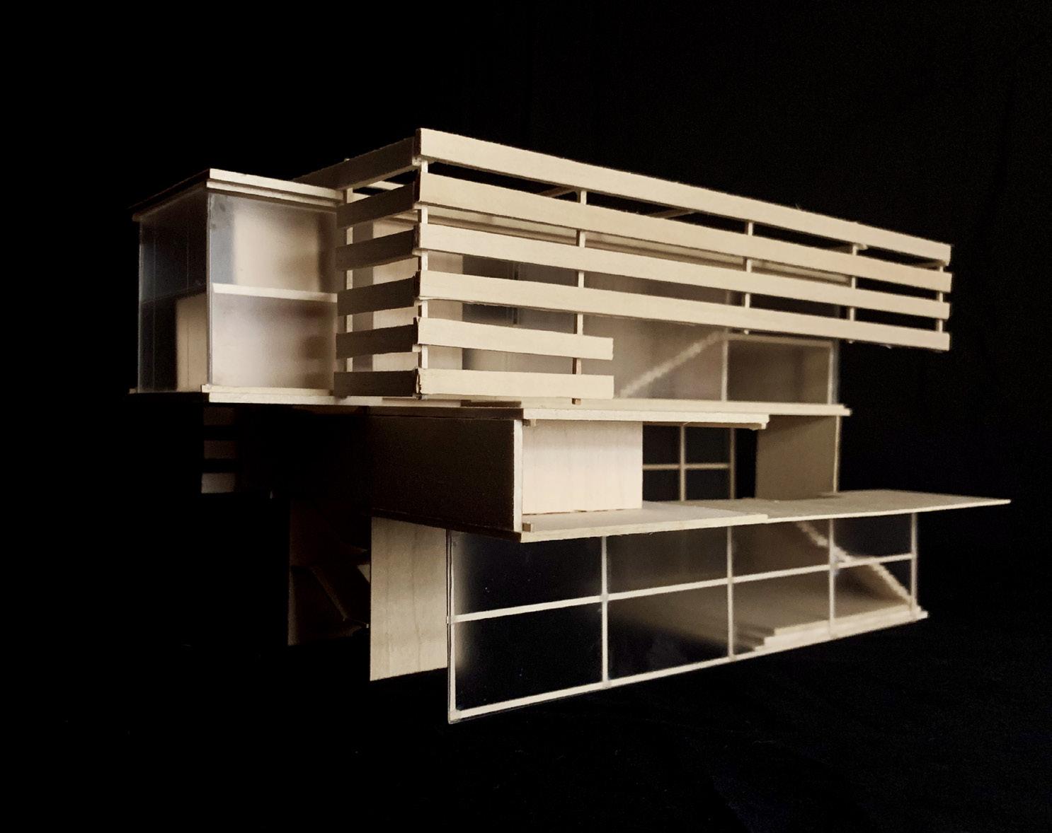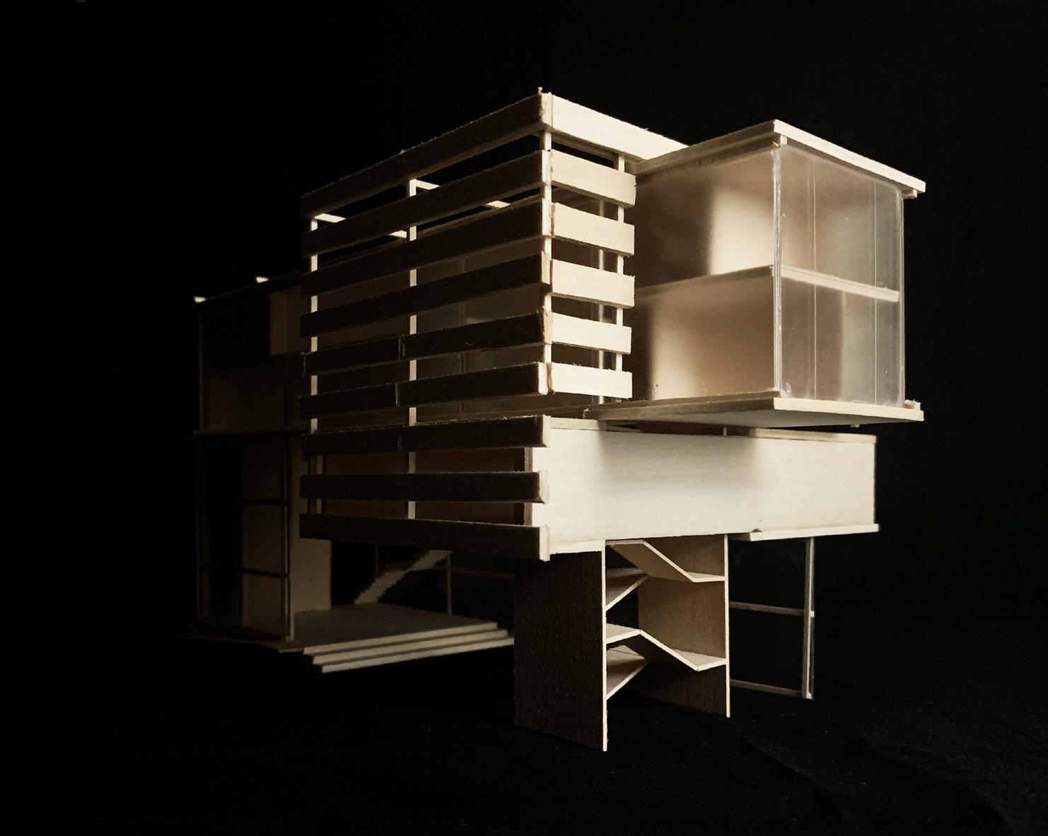 This studio analyzes ideas of the urban context, site, and program on a larger scale than previous studios. This project includes three intersecting masses, one of which holds service spaces of egress stair and elevators that anchors the masses vertically at the interacting axis. The two crossing masses shift past one another in opposite directions, extending out towards the city, and holding the street edge from above. The program consists of an open-floor gallery space for viewing art through a more informal circulation and classrooms and studio spaces for visitors to experience the art firsthand. The ground floor serves as an interactive space between the street and the project. It features a