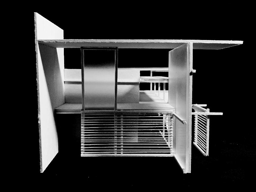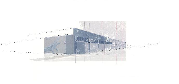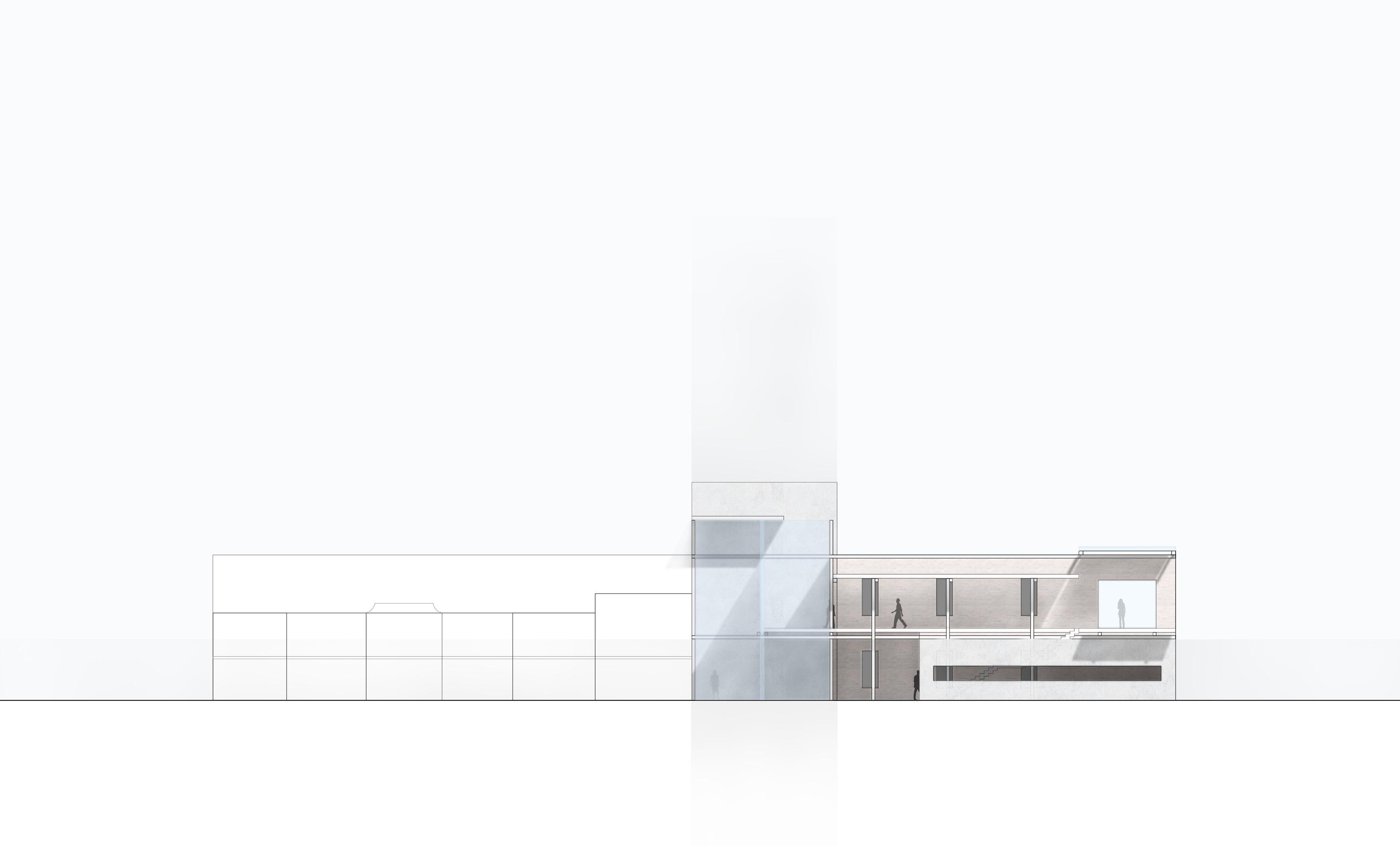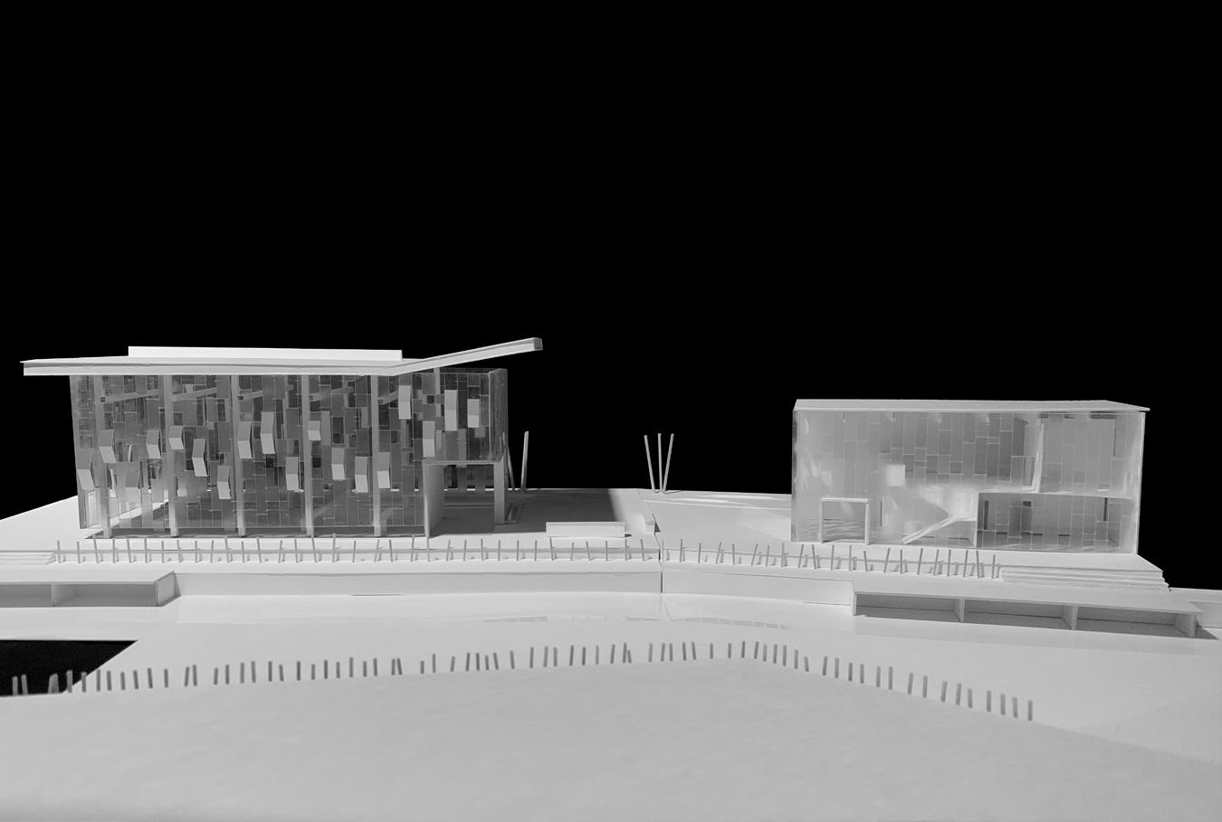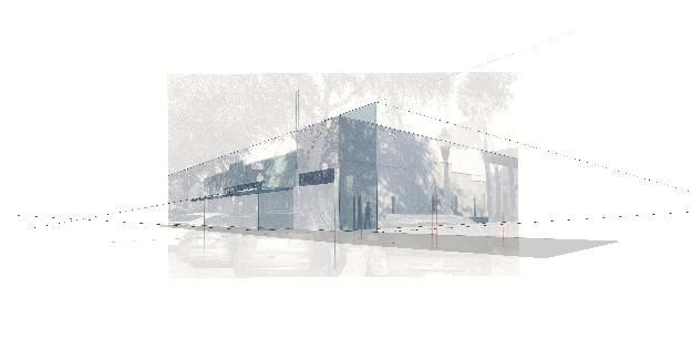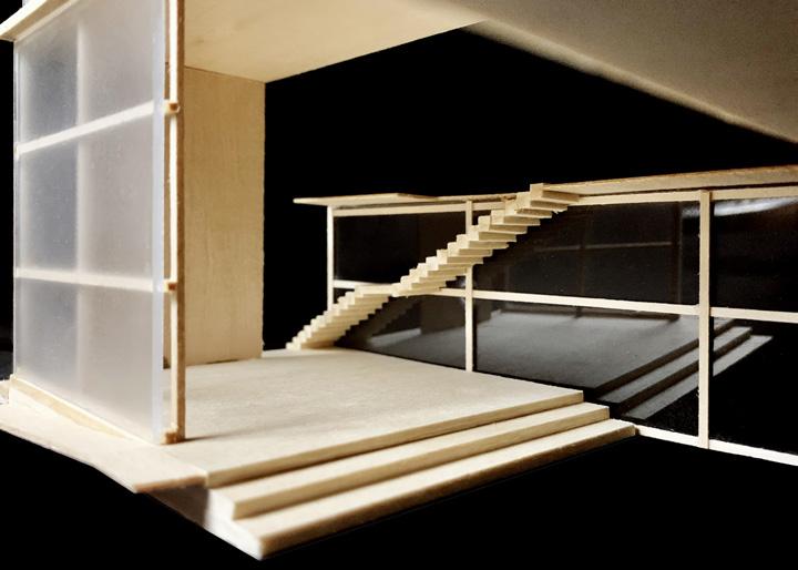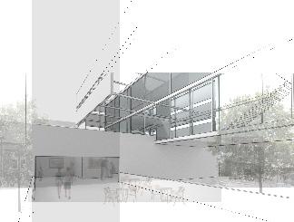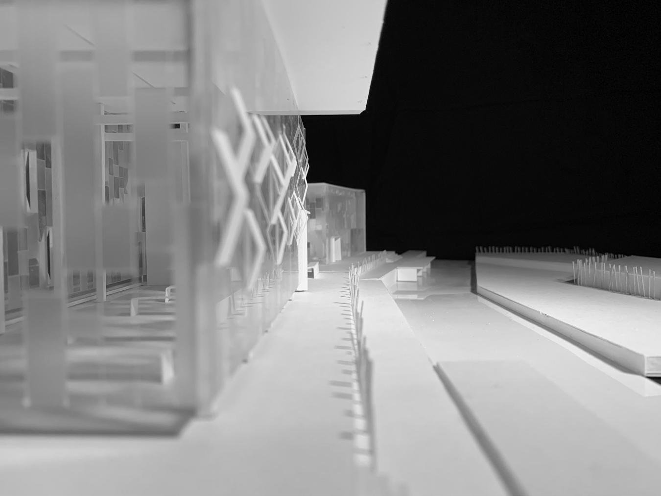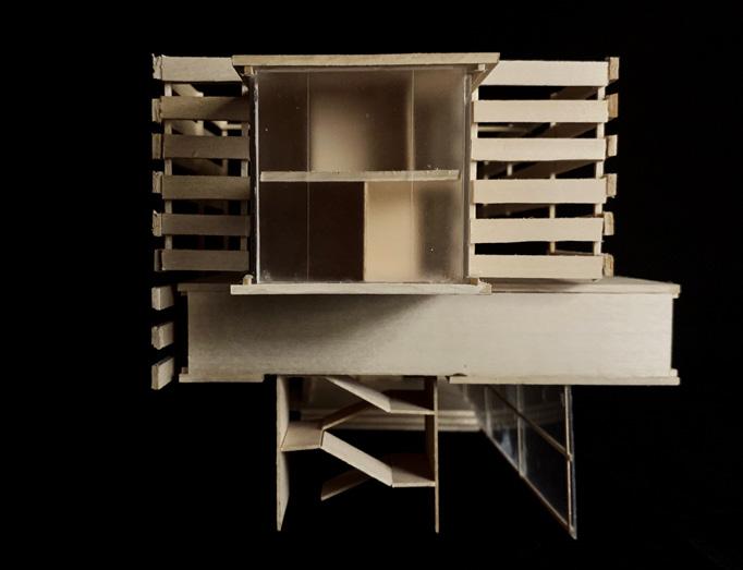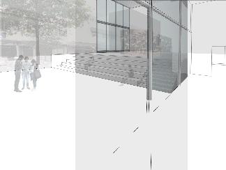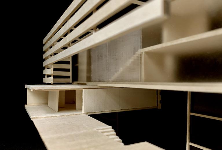 stage area for musical performance and gathering space for those who want to interact with the site without moving through the more private spaces above. The directionality of the intersecting masses serves to frame views down the city, shearing just past the edge of the adjacent building to emphasize directionality of viewing within the studio spaces. The glass facade allows for viewing, while frosting and other detailing elements filter light. The screen-like facade that wraps part of the upper level serves to provide more privacy in the learning spaces above as well as further the connection to the urban environment surrounding the site.
