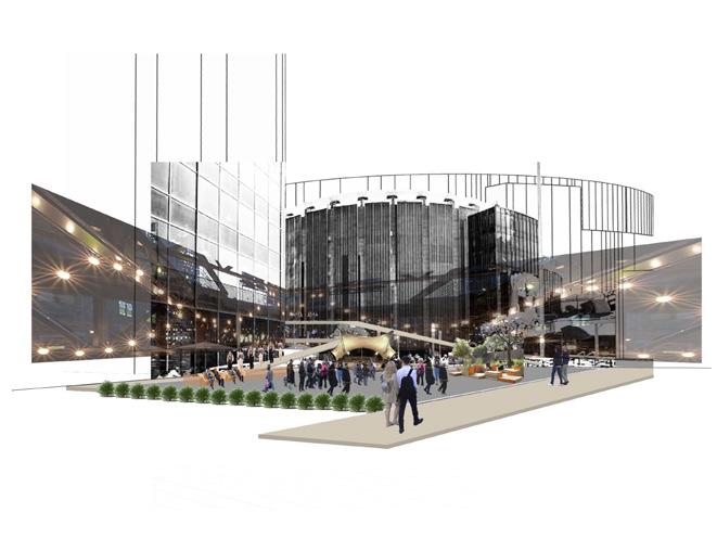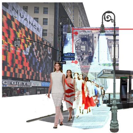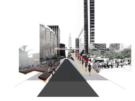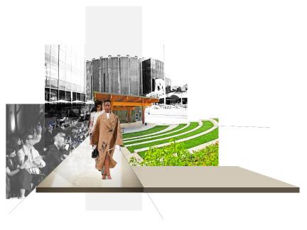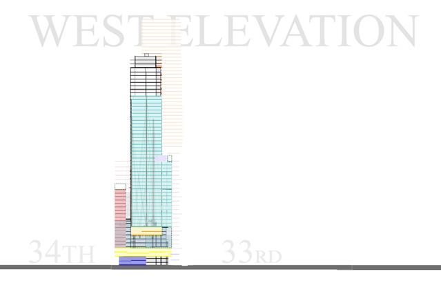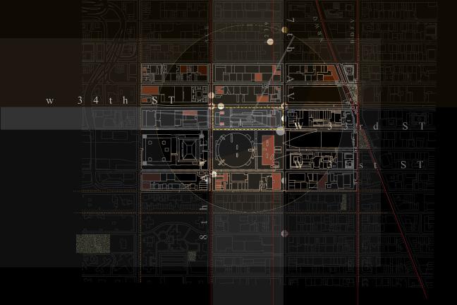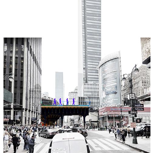 people occupying the project, and the subways below. Initial concepts were formed beginning with the relentless axis of former 33rd street, forming the main passageway through the site, which acts as a catwalk for people to be on display as they move through the site. It emerges from the subways and pulls all the way through to the other side of the site. There is also a smaller catwalk that peels from the ground giving a different vantage point for the occupants. This bridge connects the ground plane to the 8th Avenue tower at the retail and theater points. Additionally, the ground is manipulated in strategic places, specifically at the subway entrances. These are covered by a grate-system that allow people to look down into the subways below, or for people in the subways to look up into the project to further that idea of “see and be seen.”