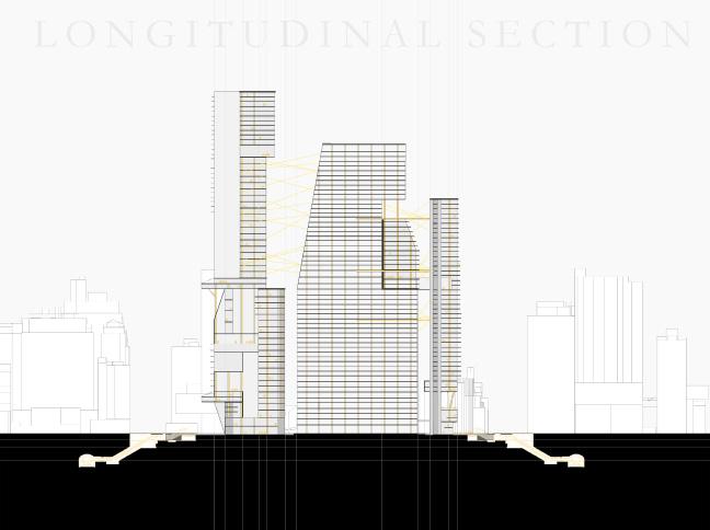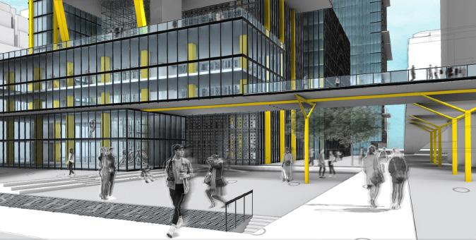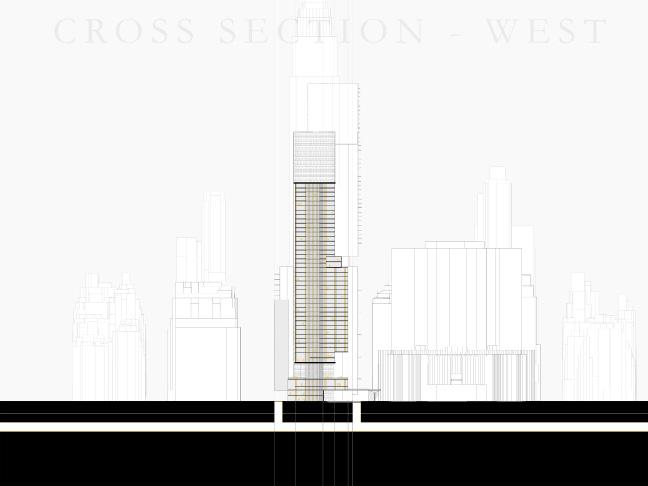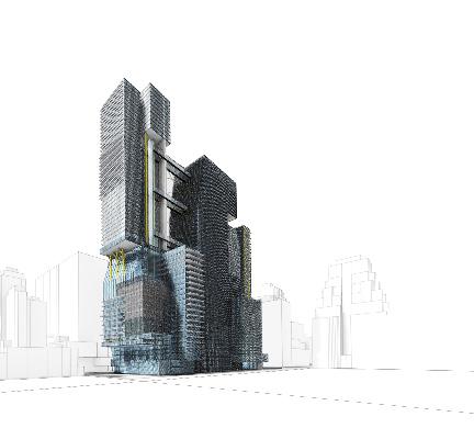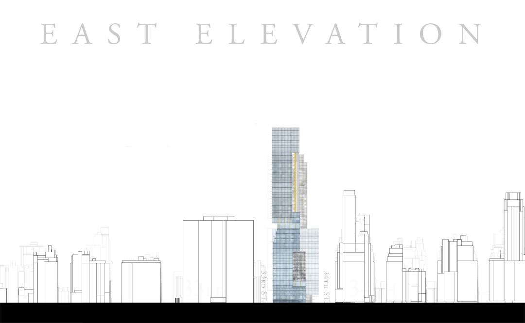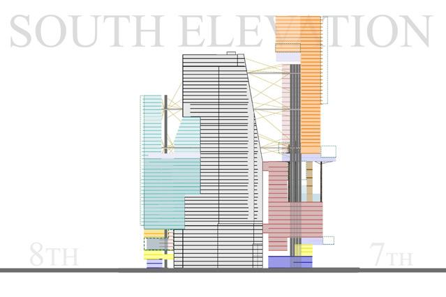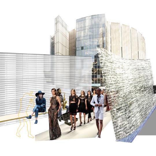 The design 7 studio is focused in Manhattan, New York at One Penn Plaza. The site draws connections to the nearby Garment District by serving as a hub for the design, production, and distribution of fashion. The ideas of stitch and tension are incorporated into the project through the tectonics of the towers and can be best seen in the elevation drawings below. The two towers are pulling away from the existing One Penn building and are stitched together with structural cables, or the “architectural grilled cheese.” The idea came from exploration of the stretch of cheese as you pull the sandwich apart as well as the tension of fabric when it is being stretched. This idea is also implemented in some of the column structures that appear in certain views of the project. The overarching concept of the project is “to see and to be seen.” This was explored on multiple scales, looking at the towers themselves, the