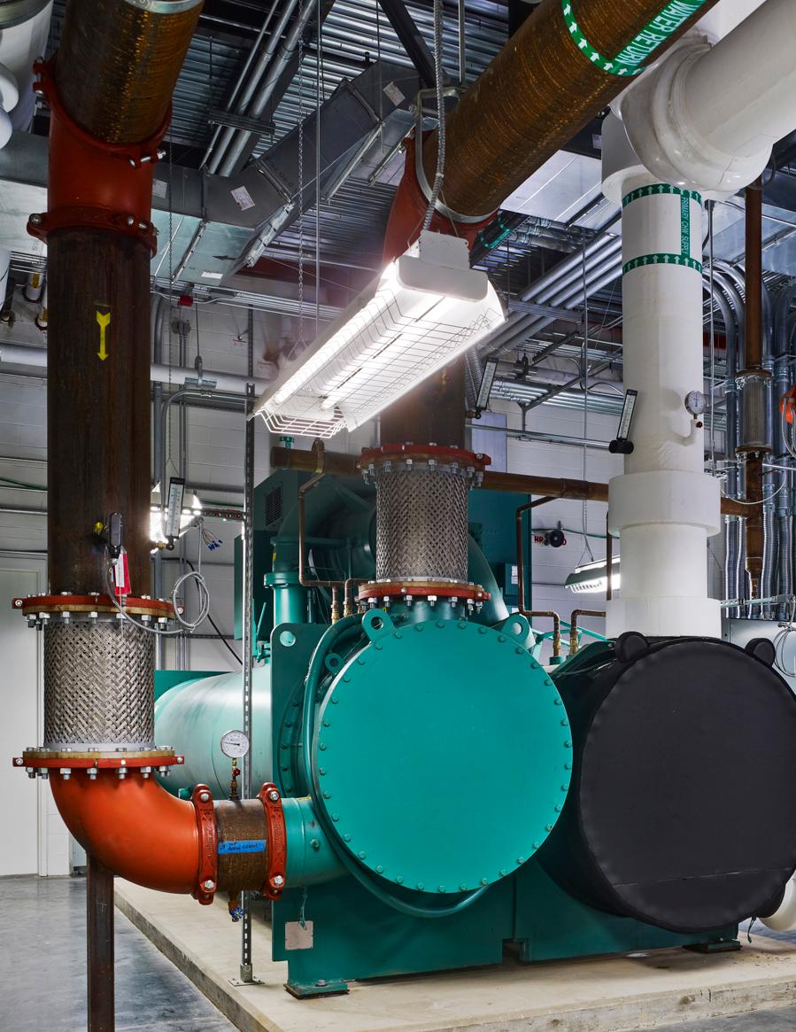 The chilled water pumping system was located on the east side of the penthouse, where there was spare space for roof-mounted chillers. In addition, due to space constraints, the limited rooftop space meant that the design did not meet the final manufacturing process requirements for the necessary chilled water loads. The design team worked with a manufacturer that could provide the largest capacity available within the constraints of the overall footprint, airflow clearances, and noise requirements. The resulting three chillers provided 700 tons of cooling with N+1 capacity. The team also included a louvered screen wall with acoustic dampening properties that allowed sufficient airflow to the chillers while also screening and dampening chiller sound output. The chilled water system utilized a 30 percent propylene glycol solution for freeze protection. It serves air handlers that serve cleanrooms and process equipment, including temperature control units, filler/ isolator, purified water generator, and autoclaves.