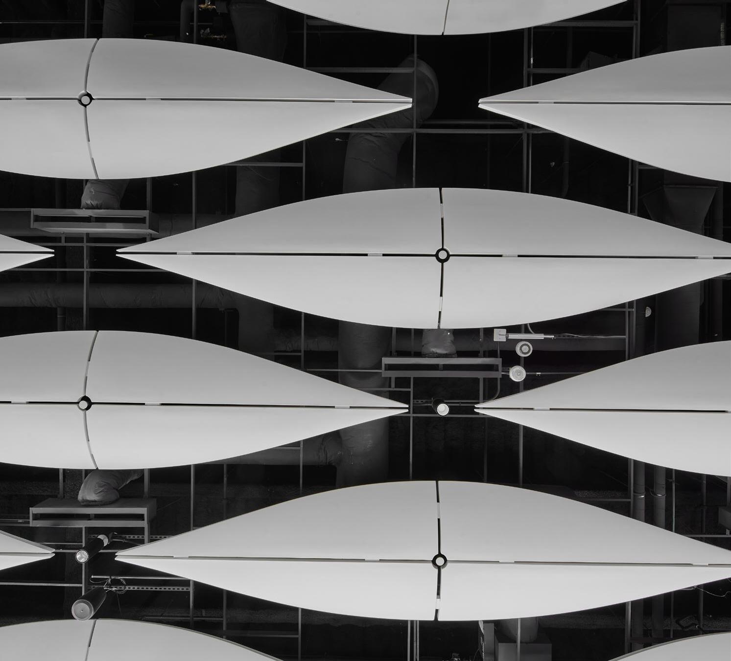 serve as key functions to the design’s intentions. For example, the building’s pill-shaped form interacts with the exterior glass pattern but was also designed to minimize wind turbulence from the intense winds coming across Lake Superior.