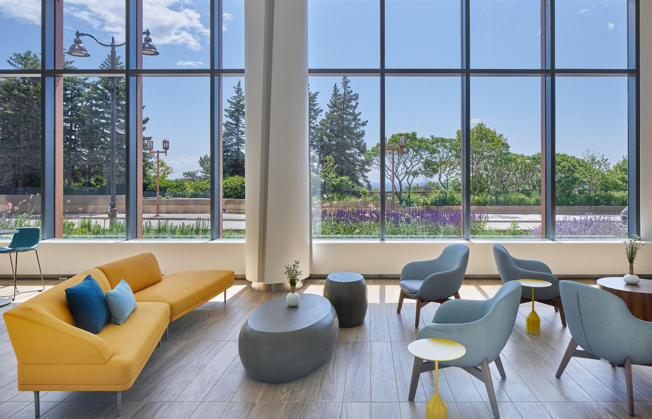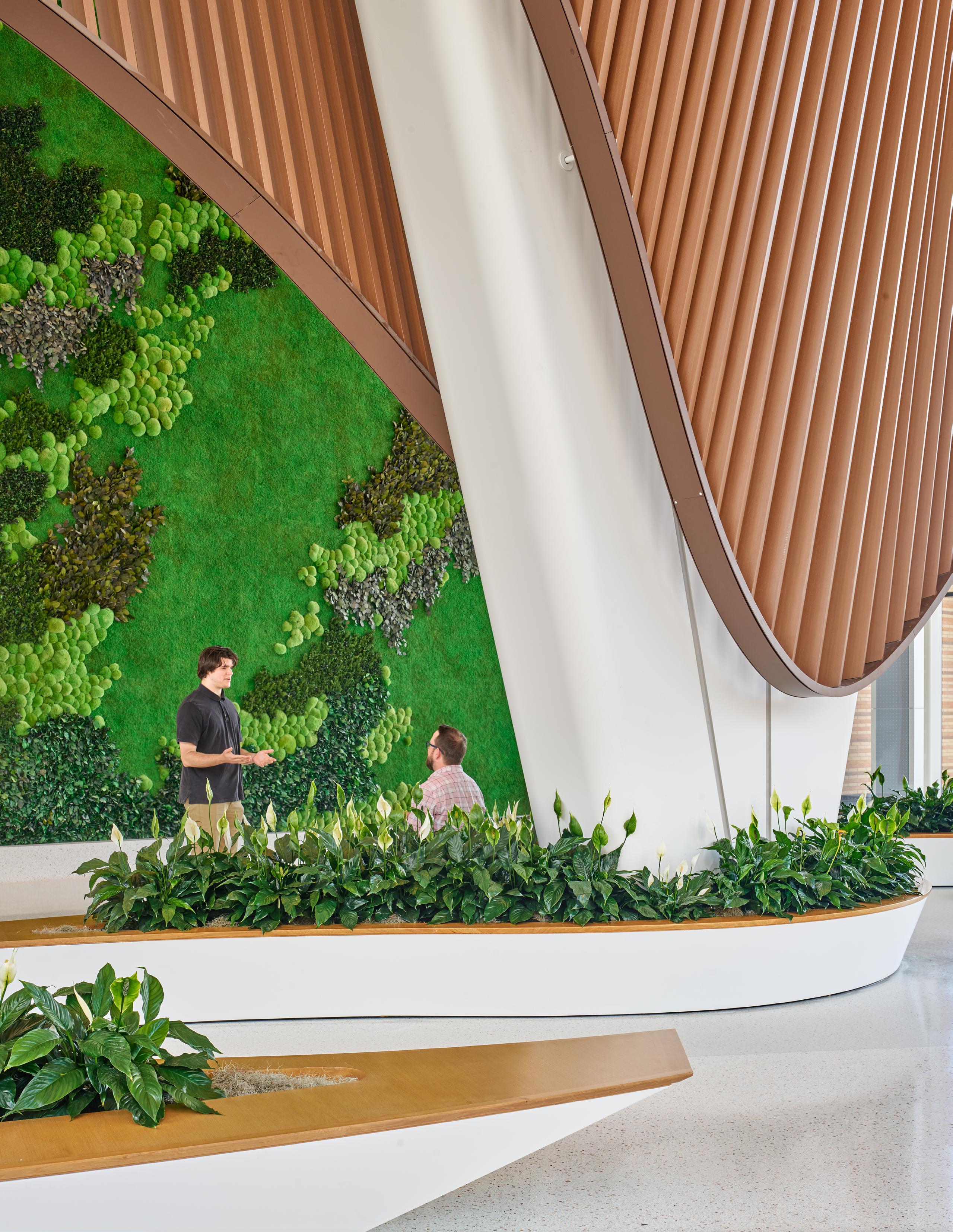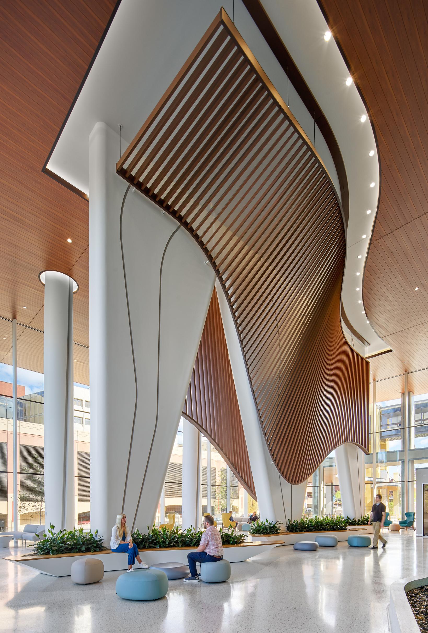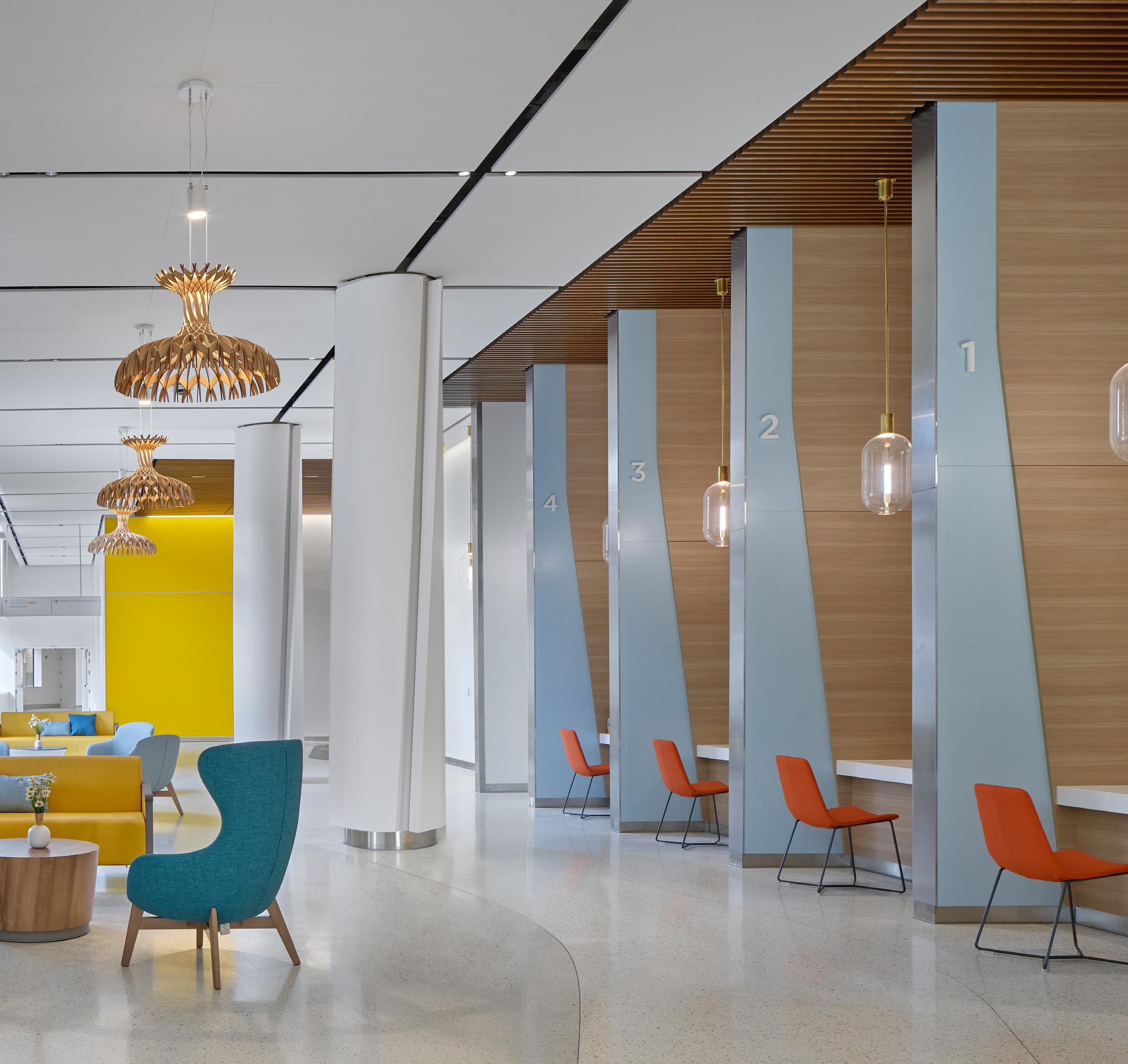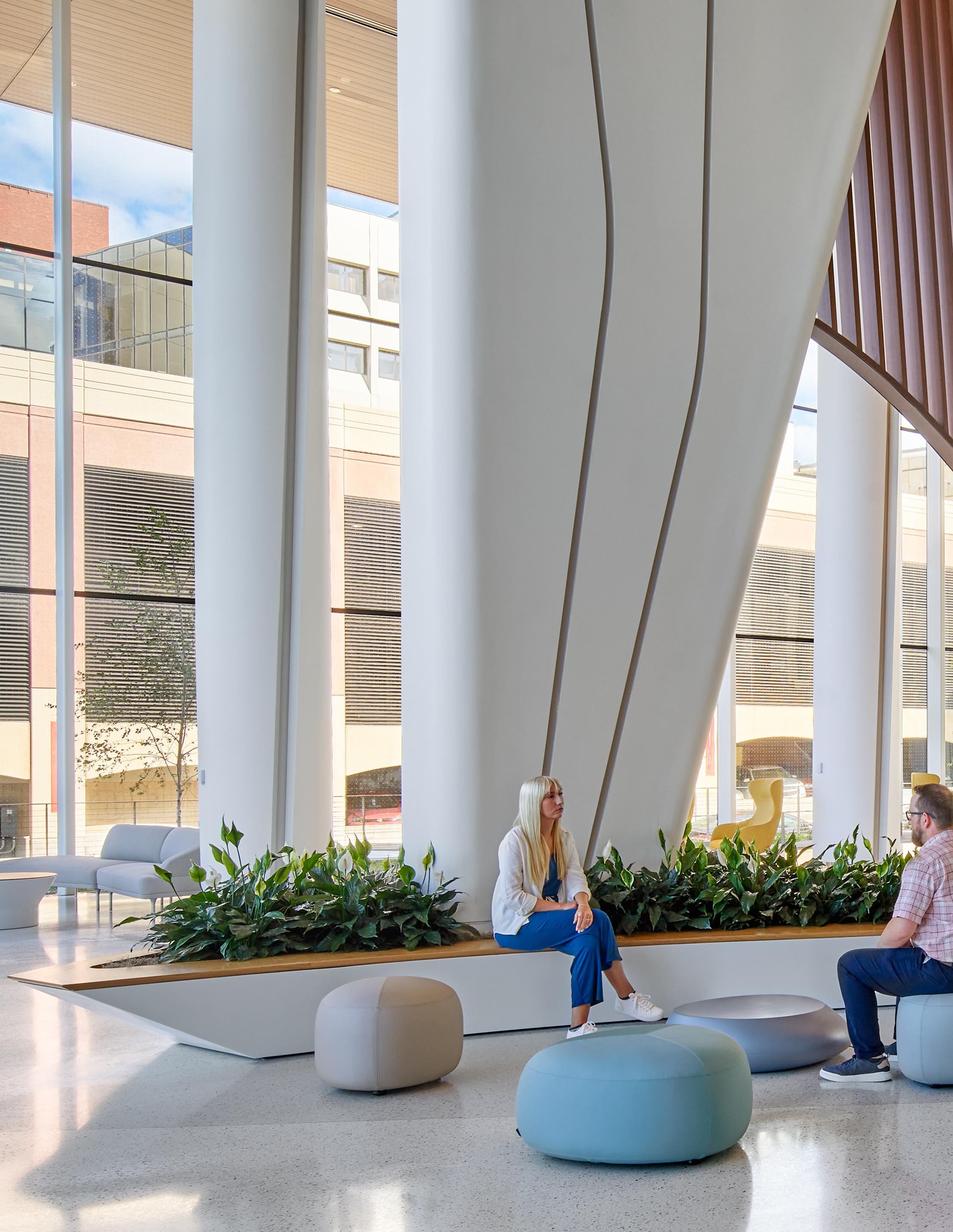 Throughout each floor of the hospital, visitors are given visual access to the outdoors. This connection to the surrounding environment influences the interior elements around them. On the ground floor ambulatory lobby, visitors are surrounded by flourishing
