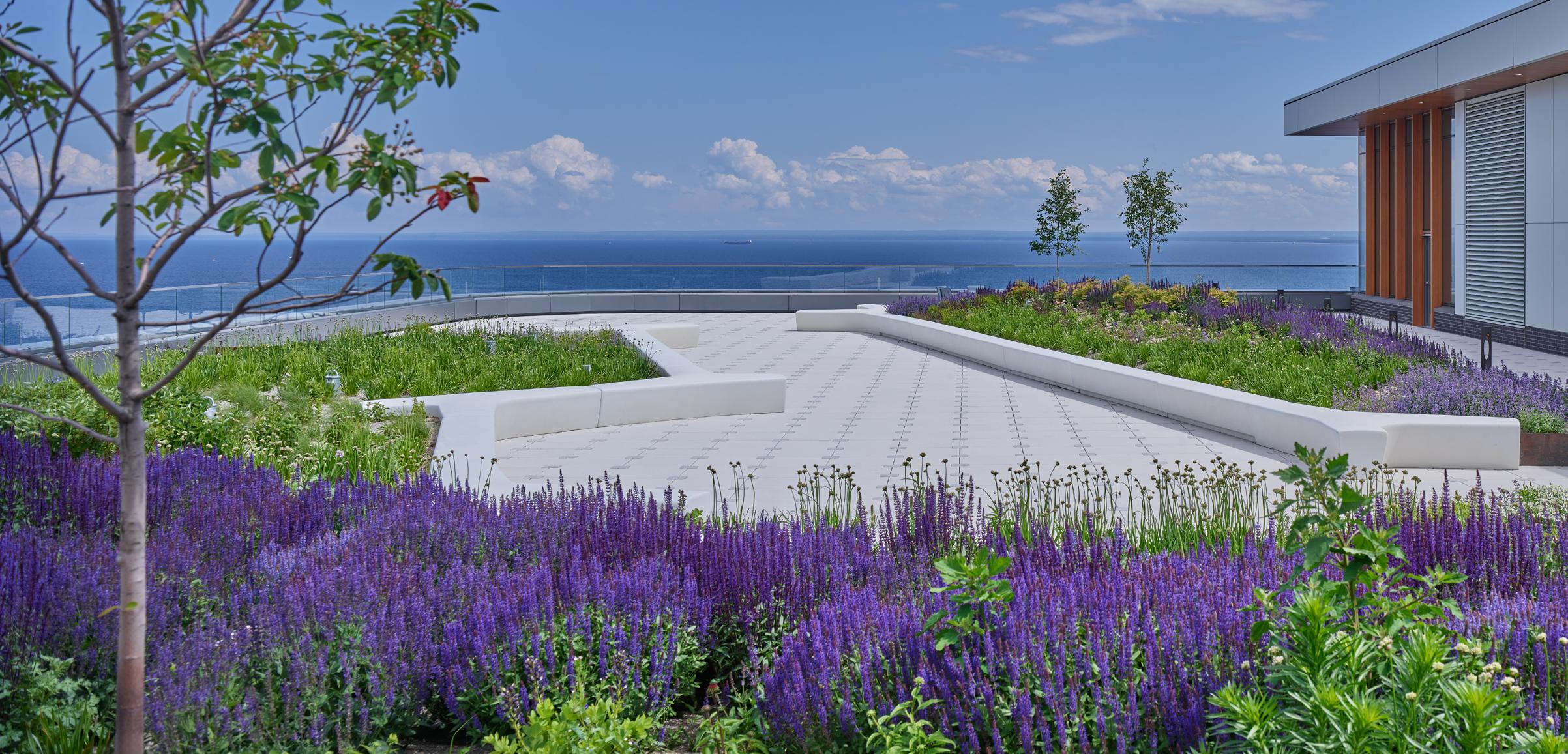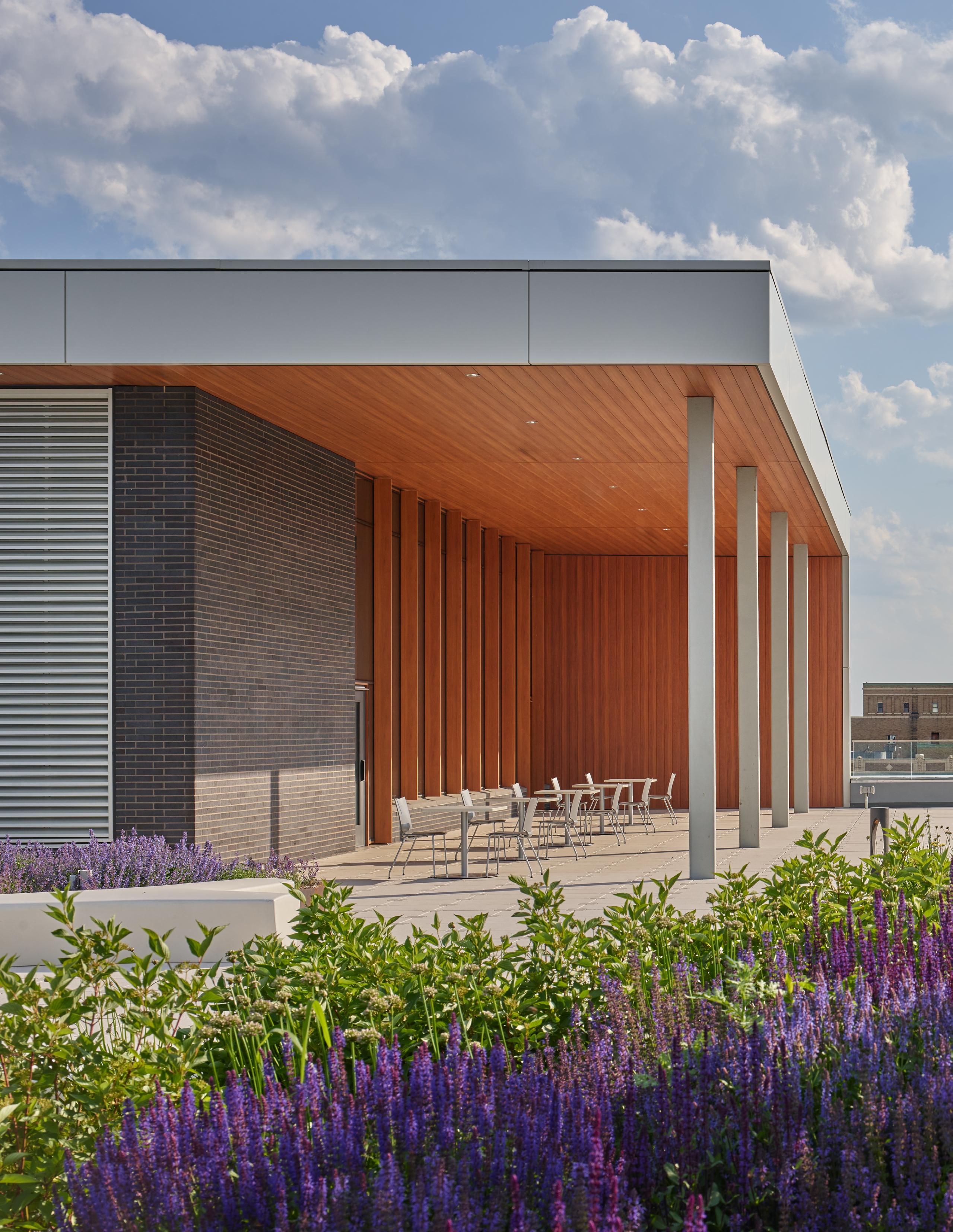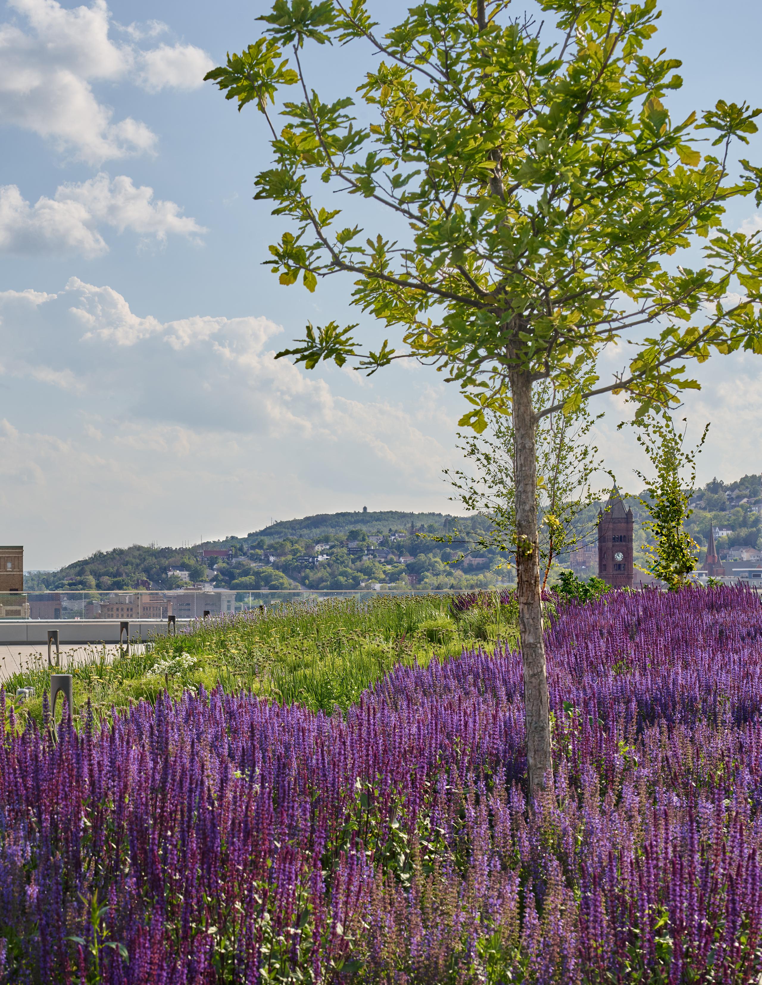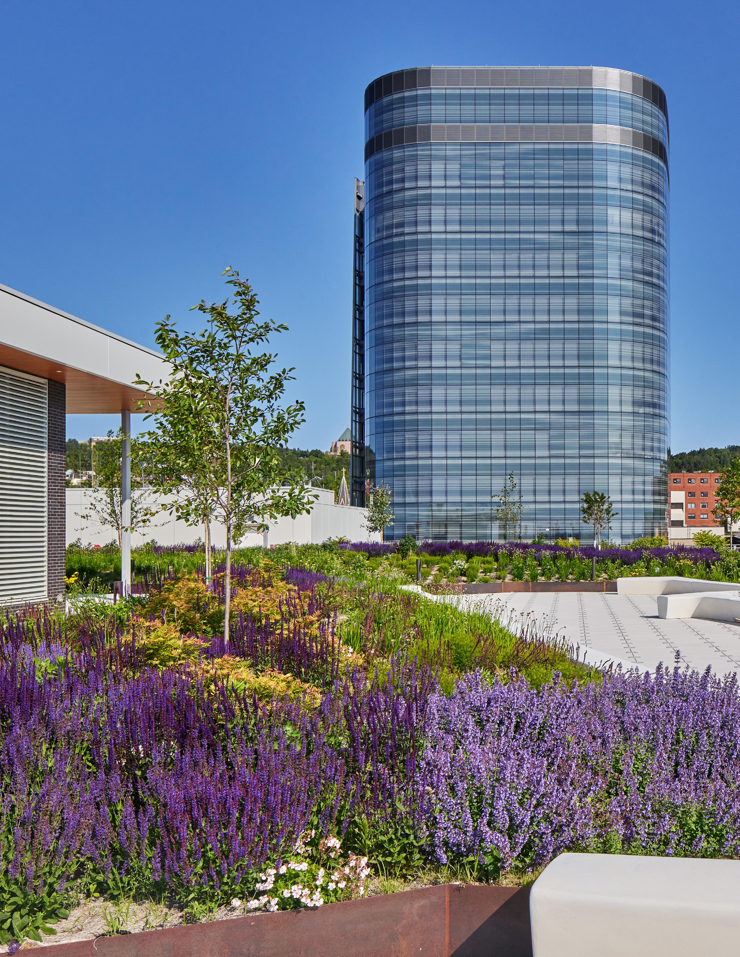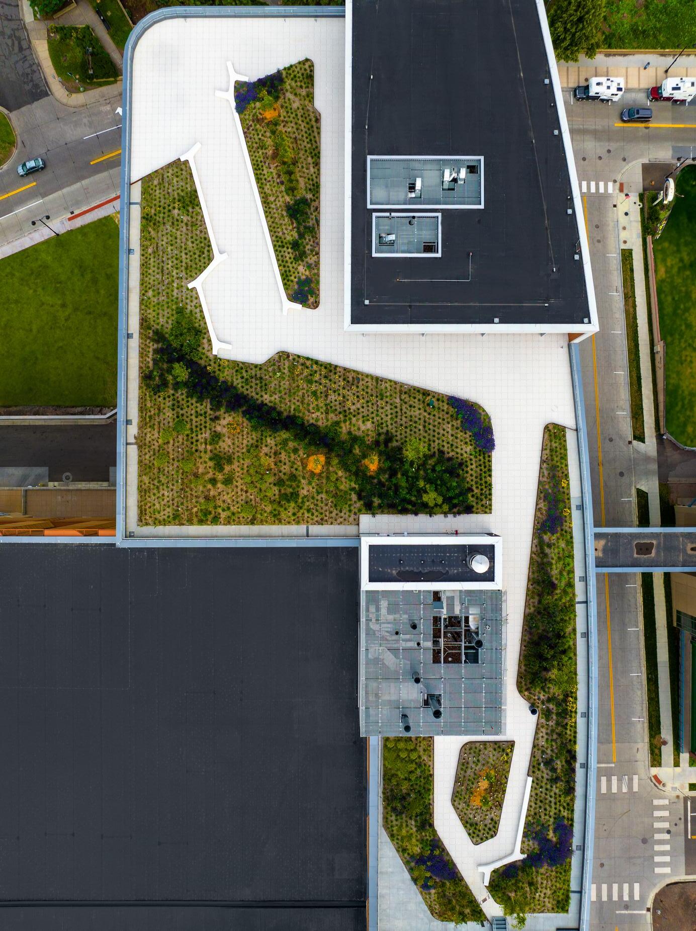 The community of Duluth celebrates the natural environment whenever possible and treasures its green spaces, whether wild or cultivated. The roof garden provides a park-like environment on top of the podium. It’s an accessible healing environment for patients, staff, and visitors, an unmatched observatory of the lake for the public, and a wonderful experience for the patients looking down from the tower. Like much of the building’s exterior, the roof garden inspires patients and families to experience and connect with the present and look beyond to hopeful futures. EC