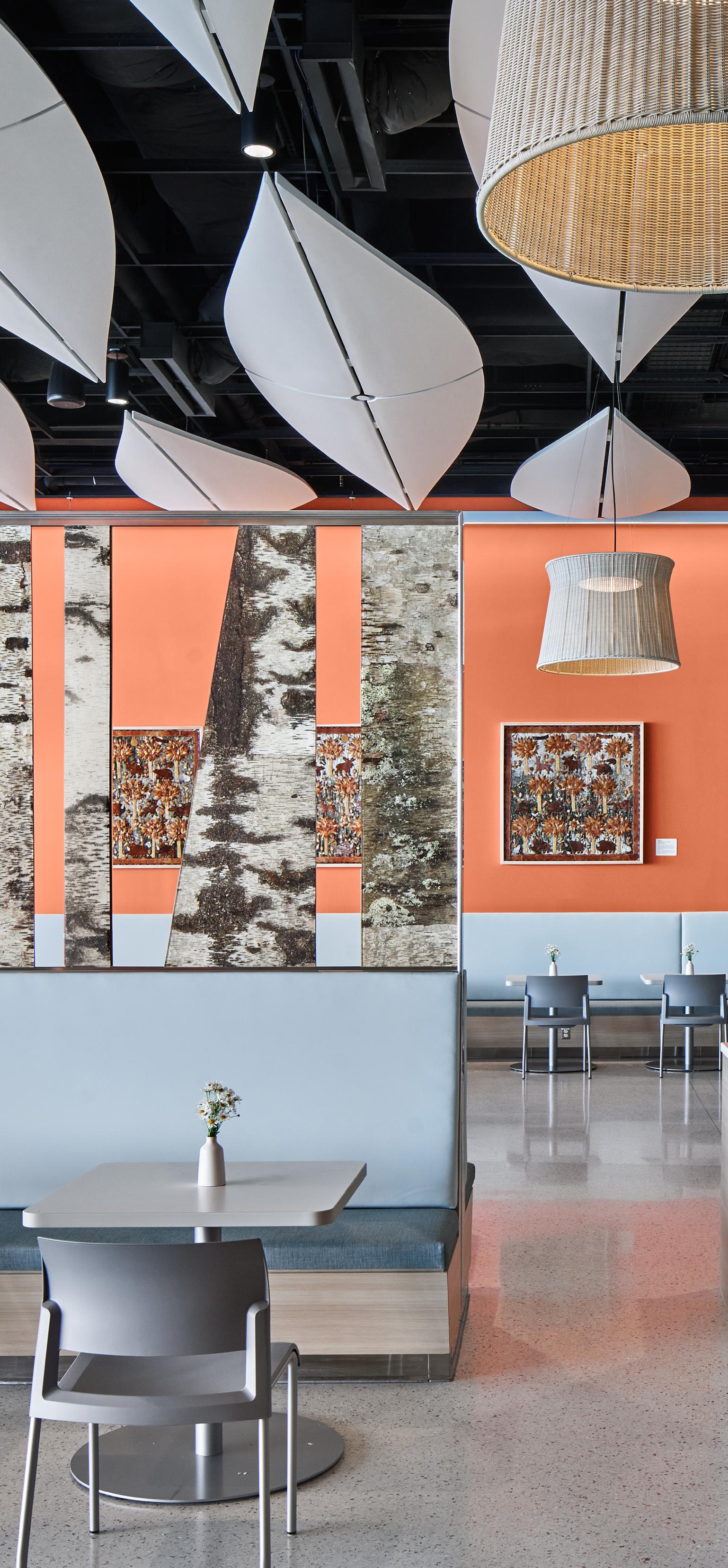 Snowshoes and canoes, symbols of the Ojibwa people’s survival skills and exploration, inspired the shape of the suspended sculptural ceiling elements in the dining hall that mimic the gentle contours of these watercraft.