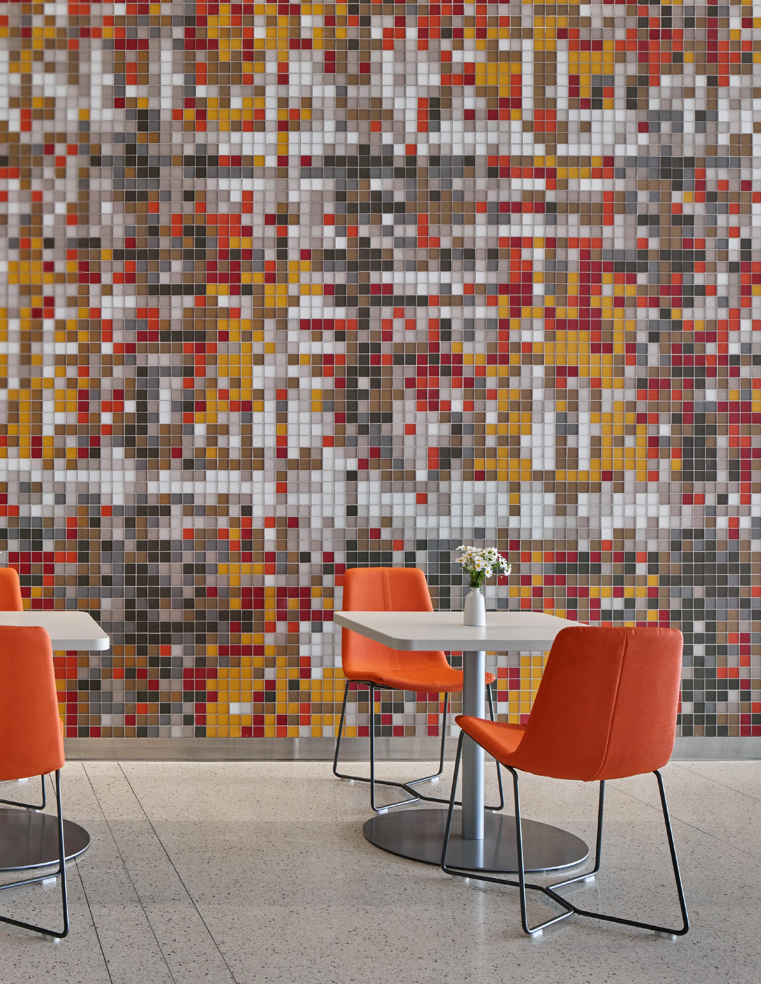The array of reds, burnt orange, and yellow stitched fabrics was then recreated with matching tiles, which now encompass the wall stretching from the server to the corridor along the west link.