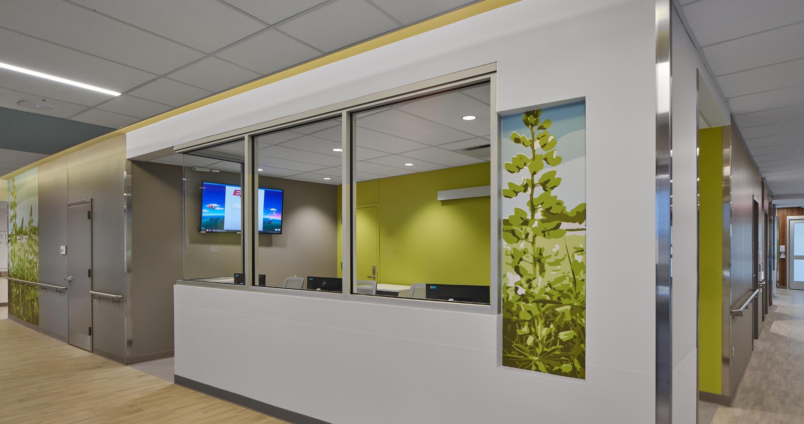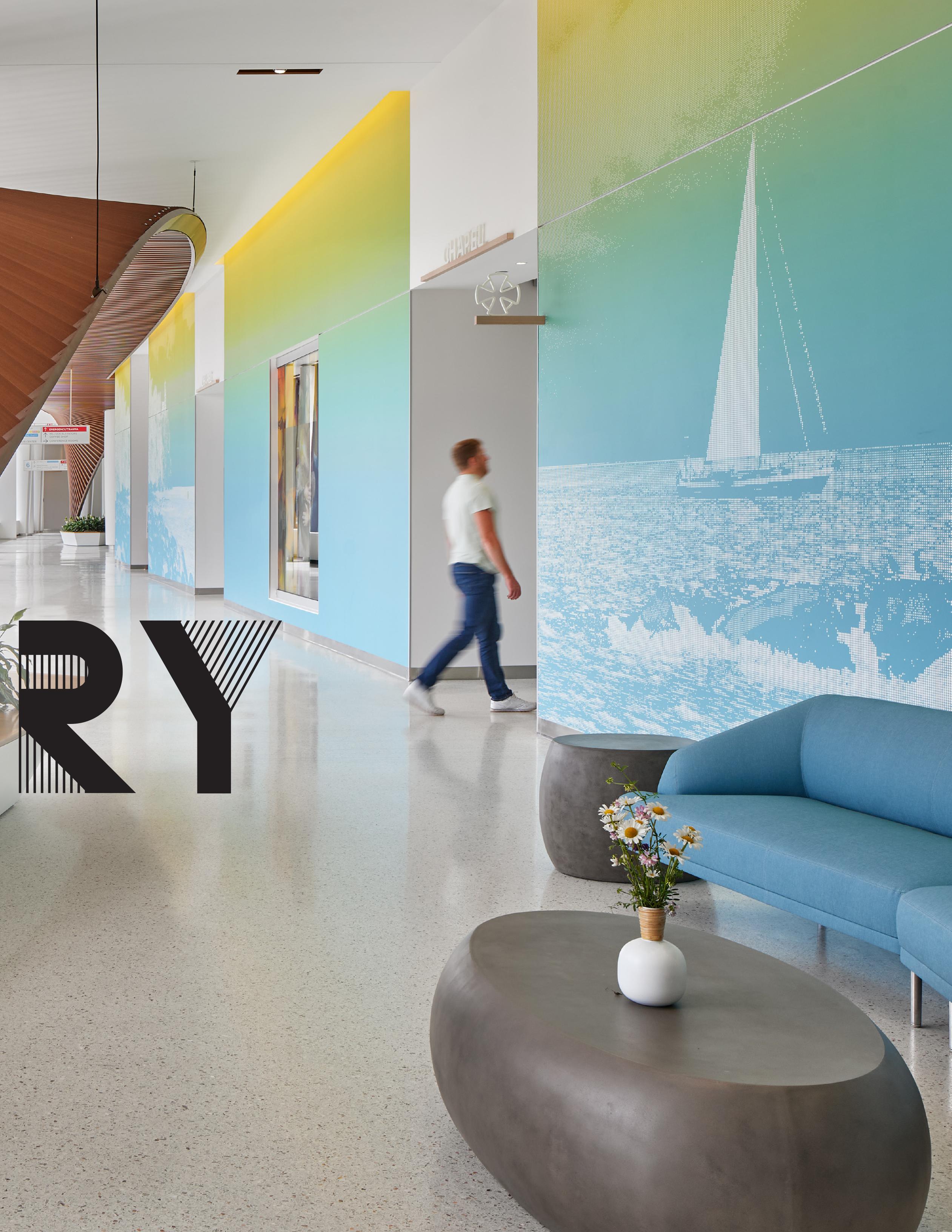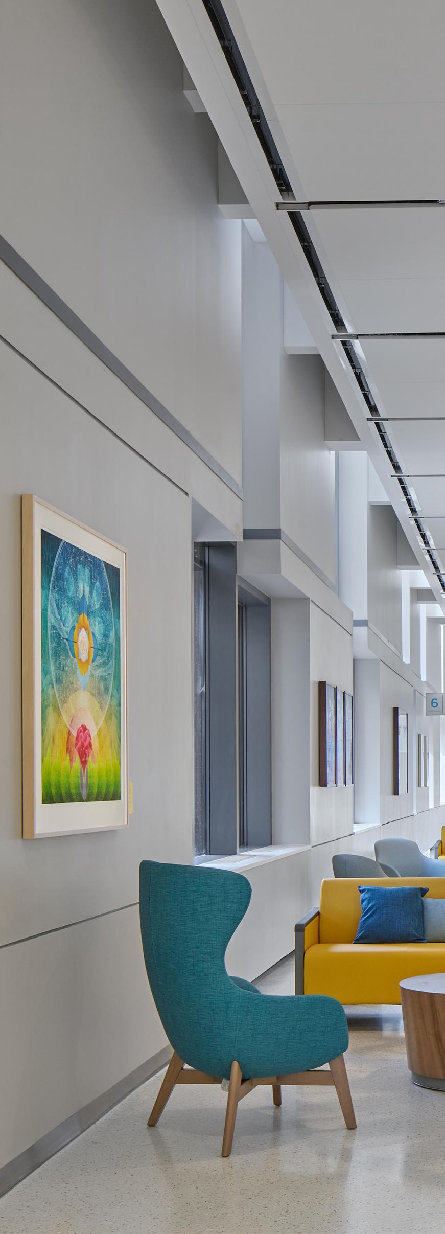 design elements provide a direct reference to the vibrant natural and man-made landscapes outside. The infusion of native plants, green spaces, and graphics celebrates the local landmarks and fosters the healing journey for patients and their families.