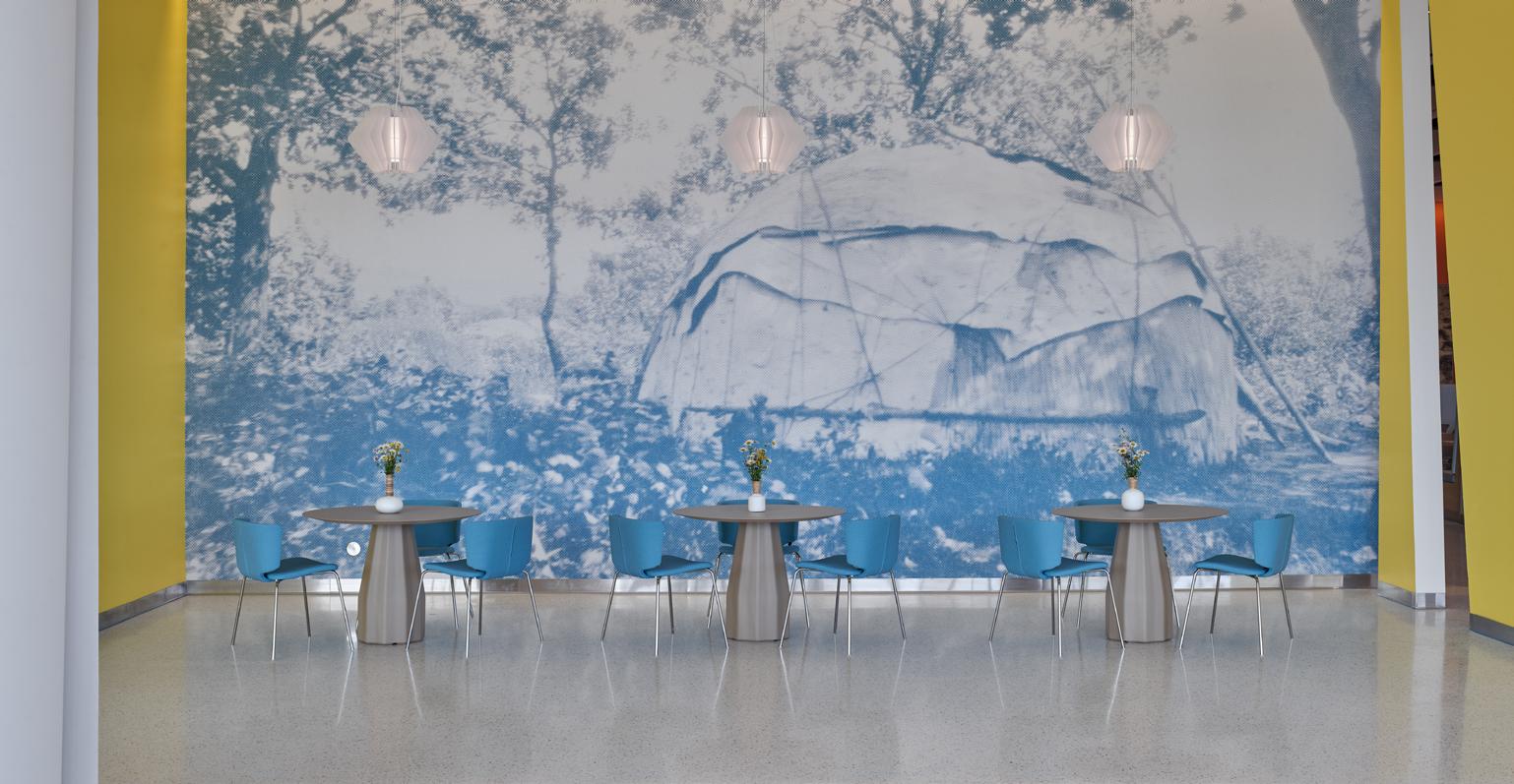 The native cultural narrative is most evident within the hospital's dining commons, a space that exceeds mere functionality and transforms into a gallery of the Ojibwa's enduring legacy. This is done by both photographic and abstract visual art and design.