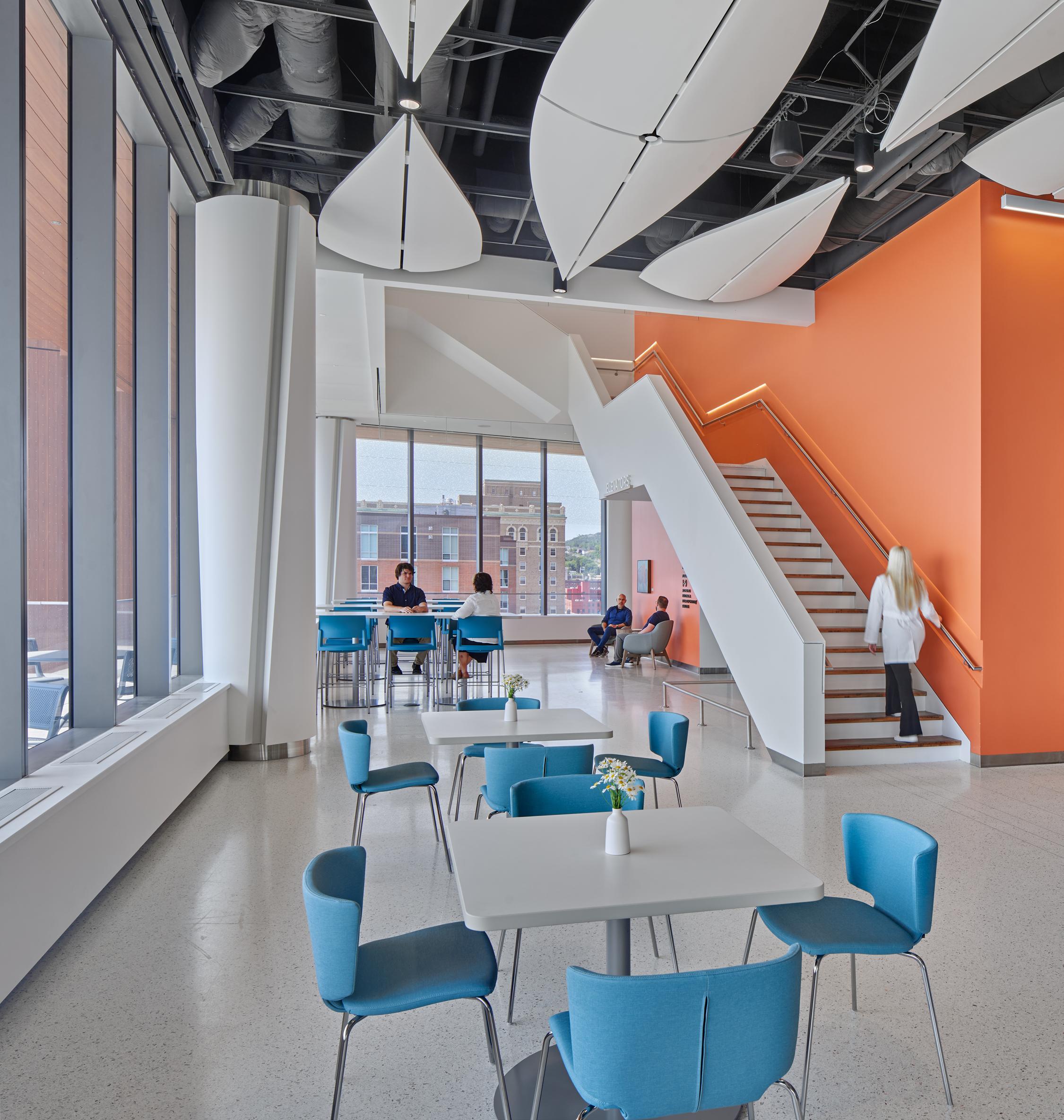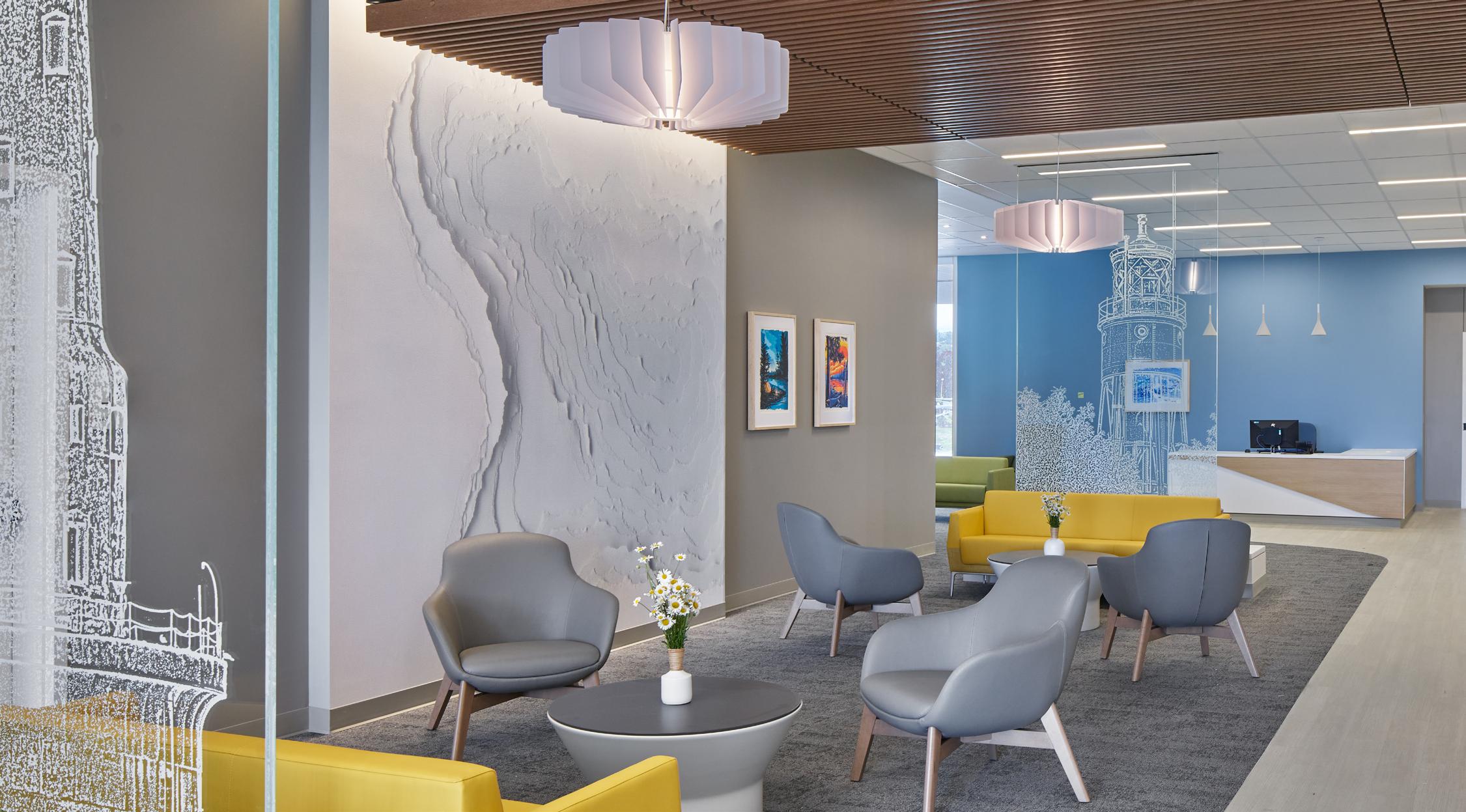 The large-scale custom graphics, featured hanging art pieces, and intricate design elements seen throughout the hospital play the role of an extensive art program, telling a story that highlights the cultural landscapes of the city of Duluth and the wider Minnesota region.