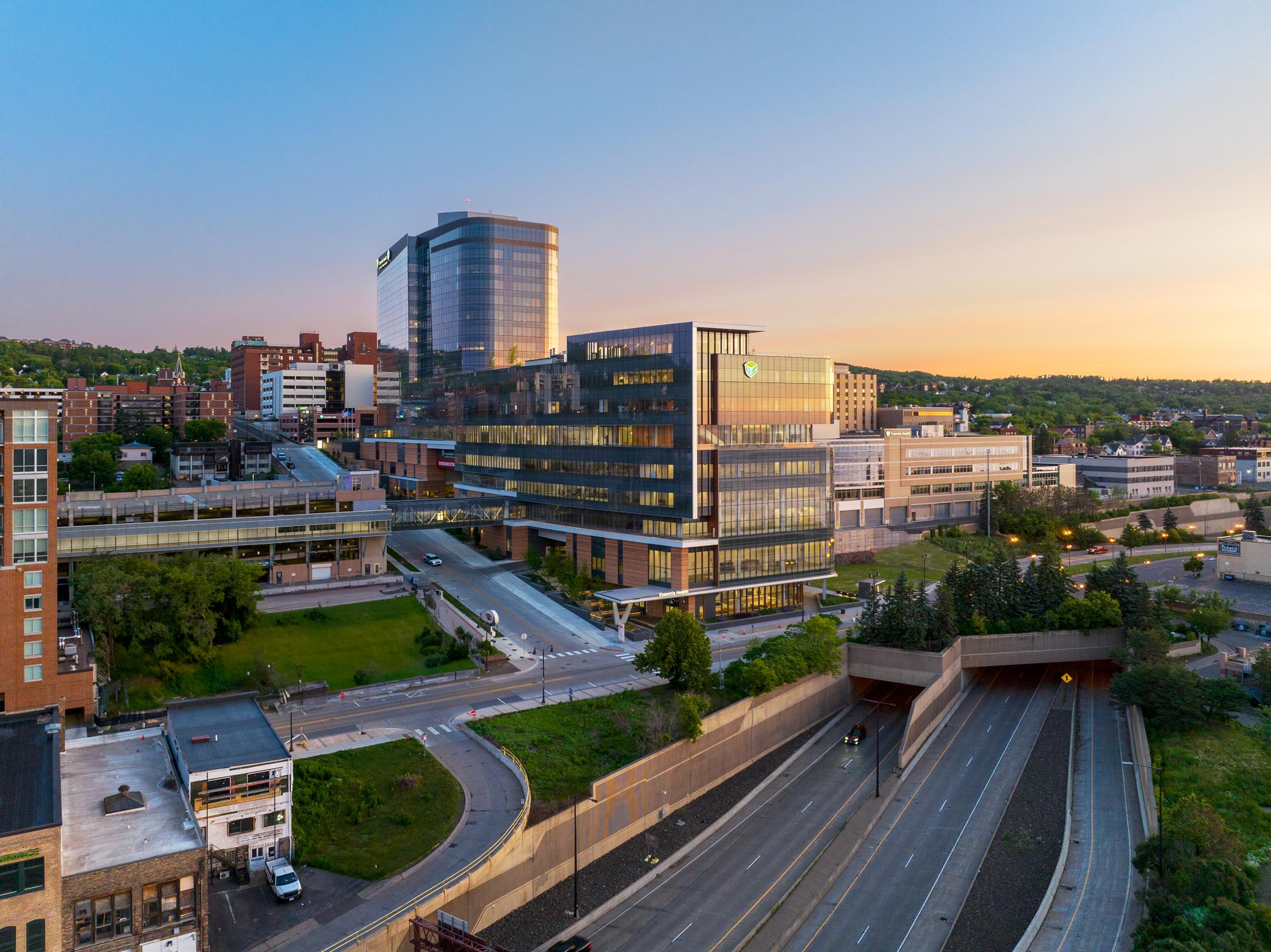 The two towers and plinth consolidate the new inpatient hospital and ambulatory facility, shifting the Essentia Health campus focus toward the waterfront. The urban design of the medical district is structured by the location of the Inpatient main