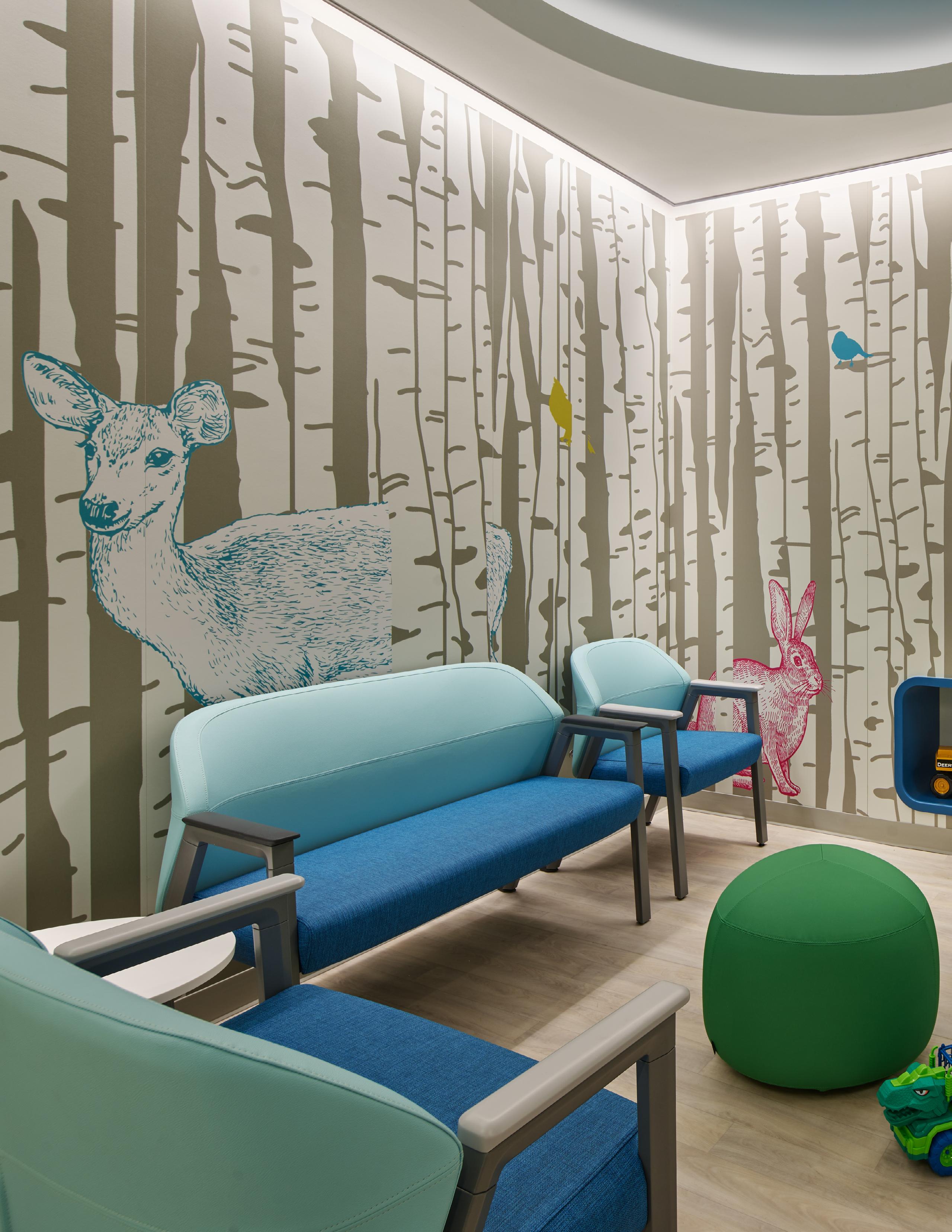 For the pediatrics floor, the graphics took their cues from the surrounding natural elements of the area, like water, birch, tree canopies, and wildlife. Many of the images seen throughout the hospital focus on the region's flora, so the design team wanted to incorporate something more lifelike for the neonatal and pediatric care floor. The primary goal was to use these graphics to differentiate the spaces based on age. This meant the pediatric lounge and waiting spaces, shared between younger and older children and teens, needed to accommodate both age groups.
