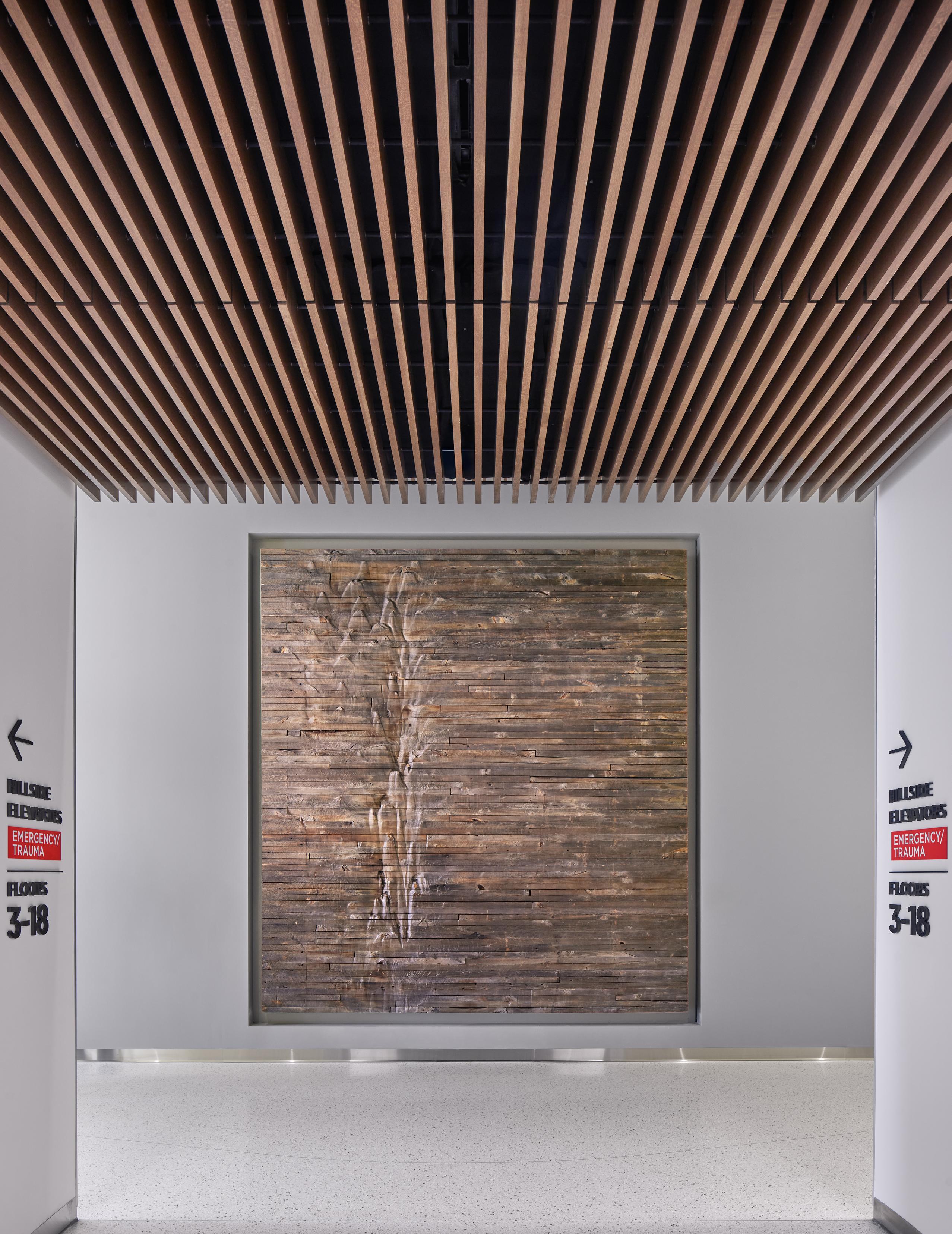 AS VISITORS ARRIVE AT THE INPATIENT ELEVATOR BAY, THEY ARE GREETED BY A PIECE MADE FROM THE RECLAIMED WOOD OF A LOCAL GRAIN SILO. ONCE IN A STATE OF DECAY, THE TARNISHED WOOD SHOWS ITS AGE WITH FLOWING MARKS OF EROSION, THE RESULT OF DECADES OF GRAIN SLOWLY DRAINING FROM THE SILO.