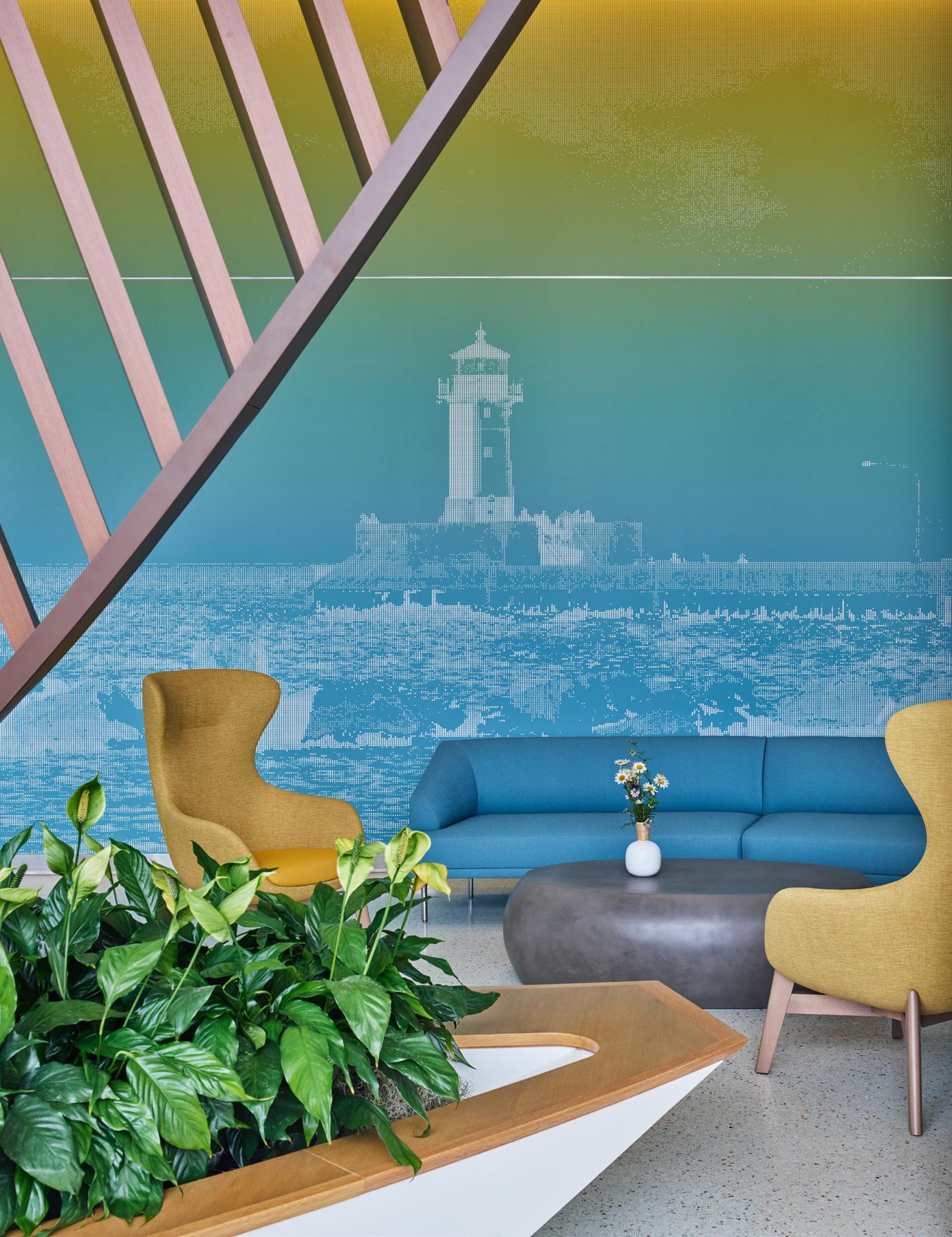 “Throughout the tower floors, we created a color accent story for wayfinding,” Kilpatrick added. “Once the color palette story was developed, we created a graphics system where each floor would get its geographical landmark significant to the Duluth area.”