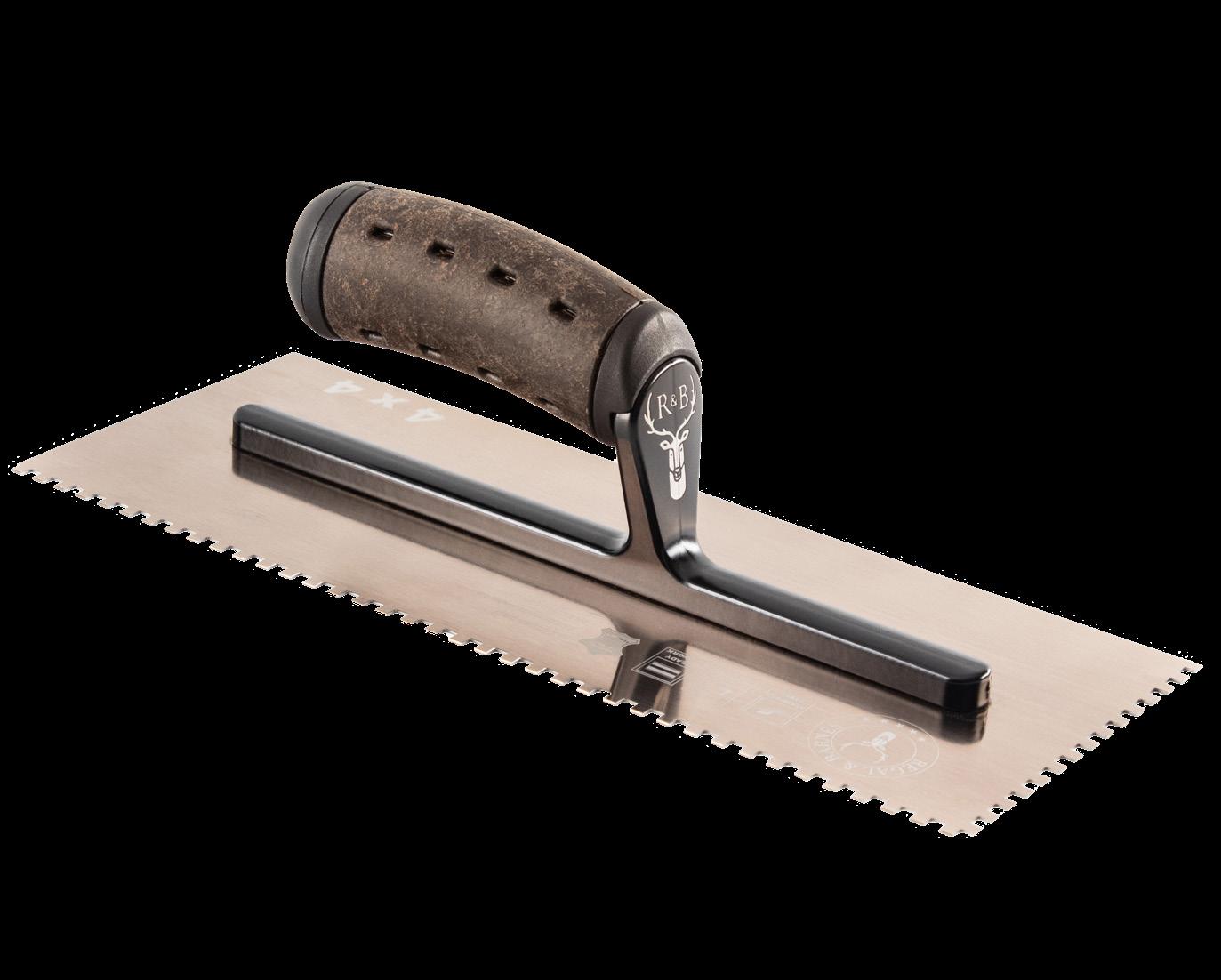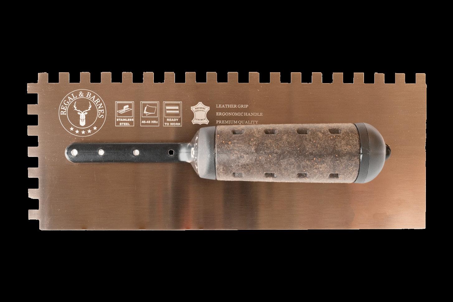 • The Regal and Barnes Gold Hardened Notched Trowel is used to ensure an even thickness is applied to the surface.