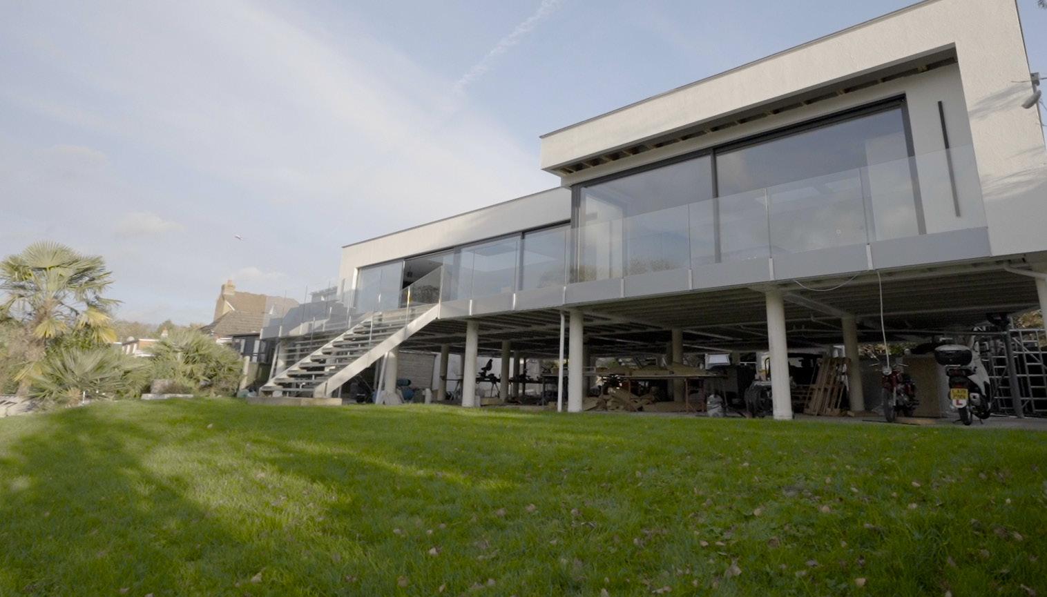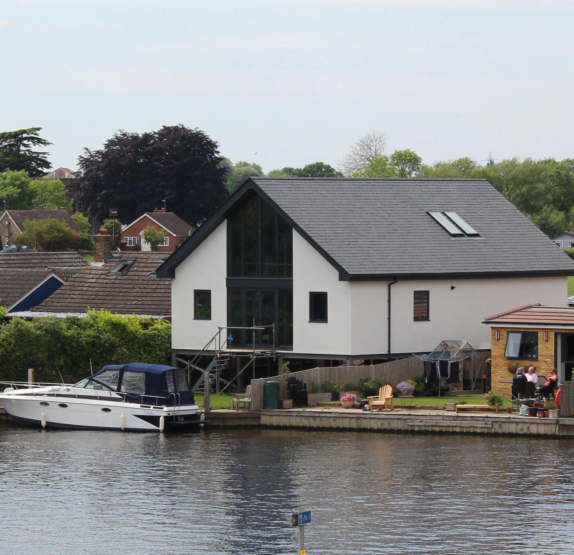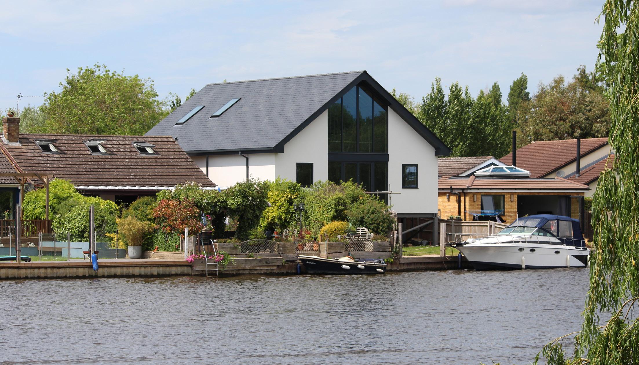 The property is a new build utilising blockwork The location on the riverside has prompted an incredibly intriguing architectural feature; the property is a new build that is elevated on stilts. As a result, it has enhanced flood protection, as well as utilising space below the property for storage