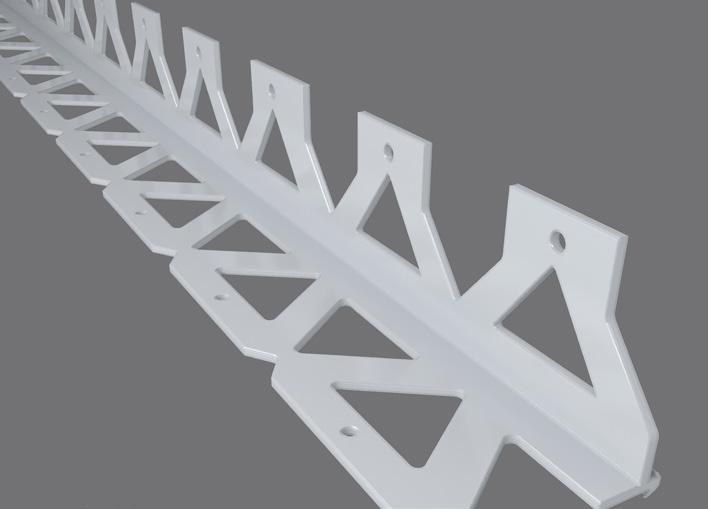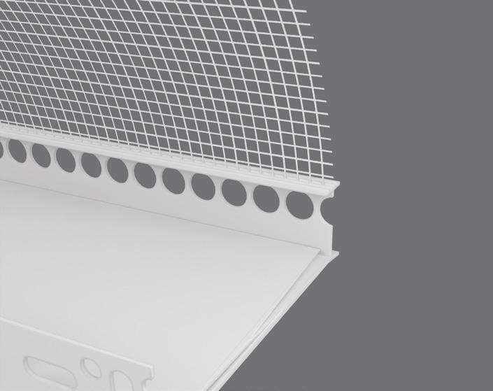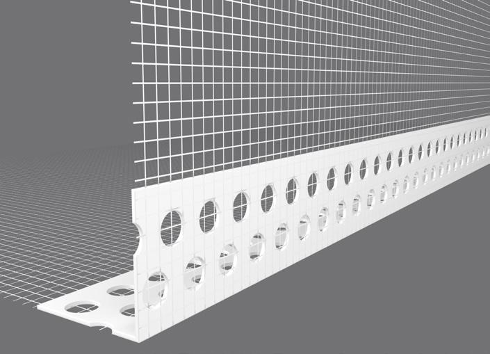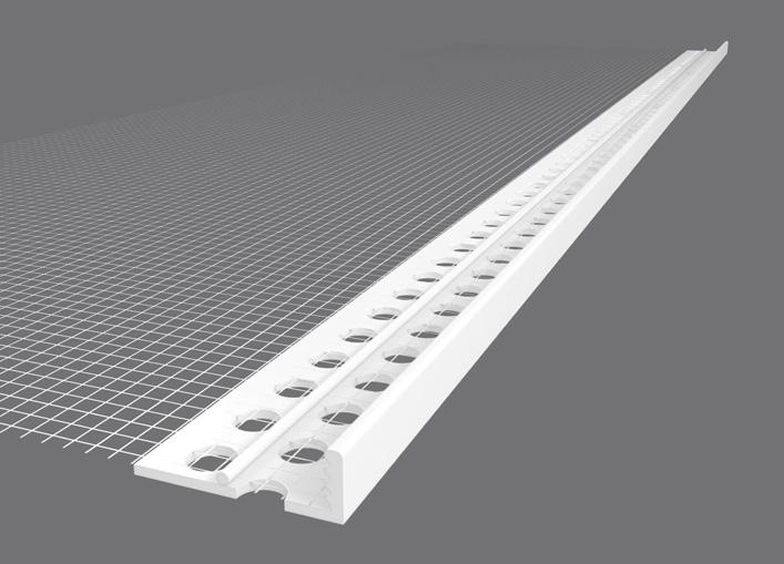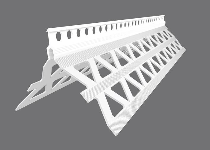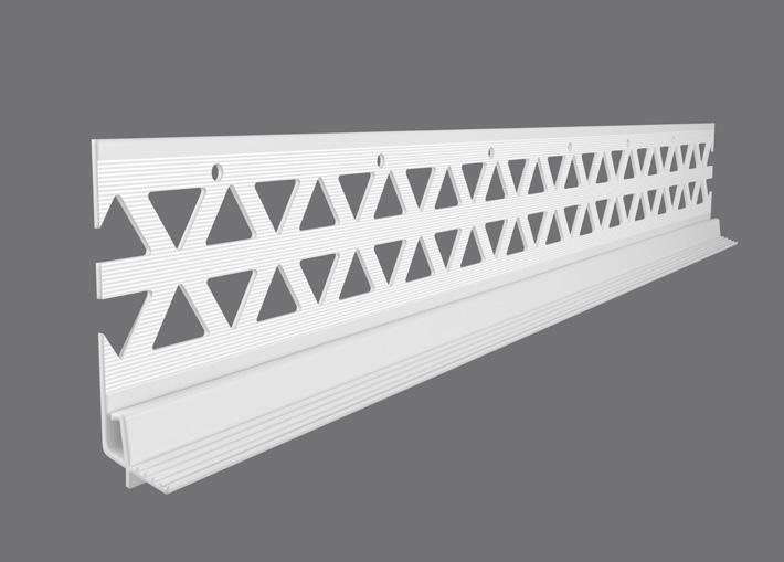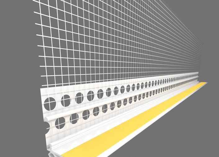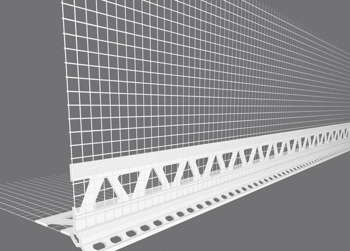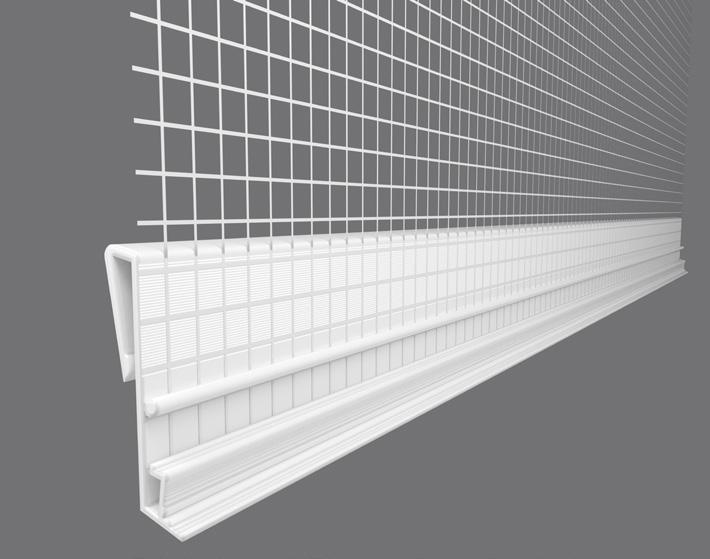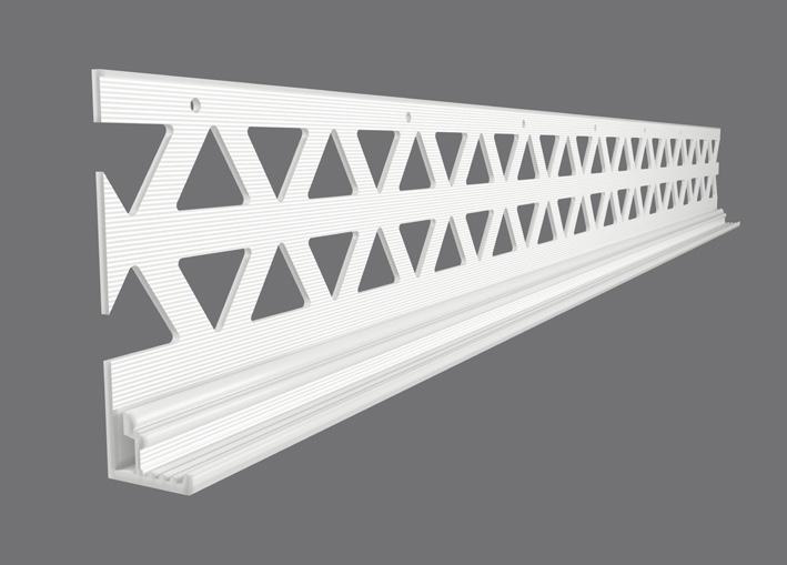 The starter track is attached to the bottom edge of the sheathing board This not only provides a level surface for easy installation of the insulation, but it also protects the base of the insulation against weather, damp and other damage We offer either a uPVC starter track or an aluminium starter track The uPVC starter track is our premium product and helps minimise thermal bridging. Aluminium starter requires a clip-on profile, which provides a layer of mesh that helps to tie the starter track together with the insulation when the reinforcement layer is added. Both types of starter track are fixed to the substrate self-drilling screws, fixed at 300mm centres to ensure the starter track is held securely in place.