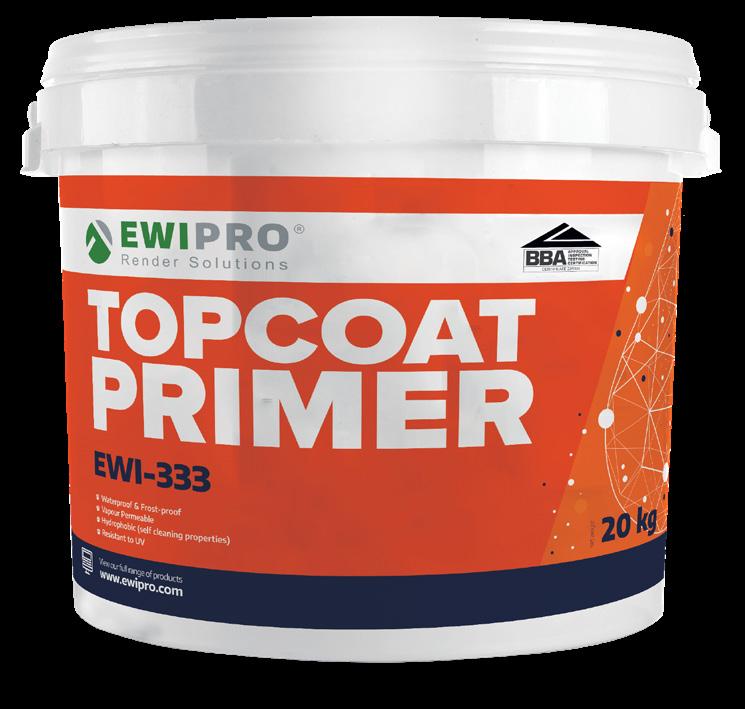 Once the basecoat reinforcement layer has dried for 24-48 hours (depending on weather conditions), it needs to be primed before applying the render The EWI-333 Topcoat Primer is simply painted on top of the basecoat reinforcement layer using either a paintbrush or a roller This should be left to dry for 12-24 hours prior to rendering The primer is also through-coloured with the same tint as the topcoat to avoid staining the topcoat and to ensure the final colour comes through on the rendering finish.