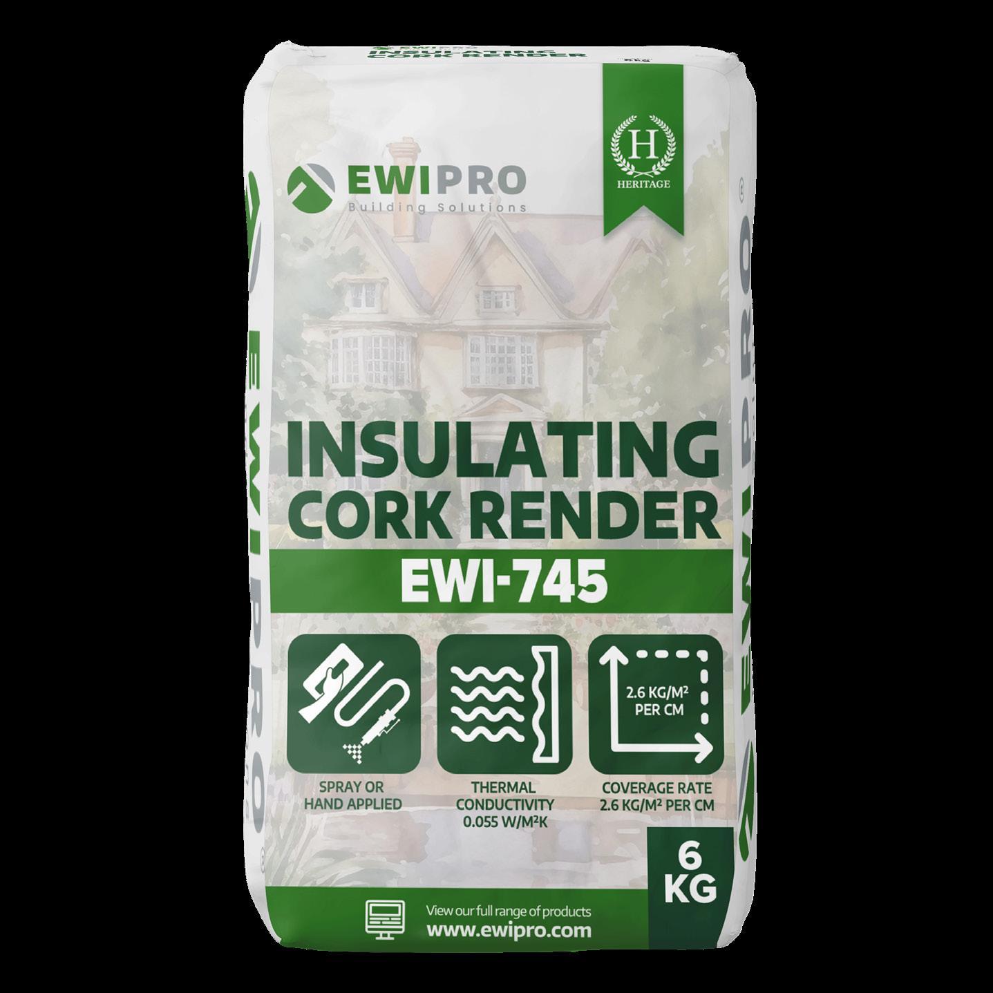 EWI-745 Insulating Cork Render is a sprayable coating mortar for the thermal insulation of both horizontal and vertical elements Its spray machine compatibility lends itself to uniquely shaped architectural construction Insulating Cork Render provides exceptional thermal performance at low thicknesses, with a thermal conductivity of 0 055W/M²K EWI-745 is breathable, which allows it to seamlessly and harmoniously integrate into a lime-based system