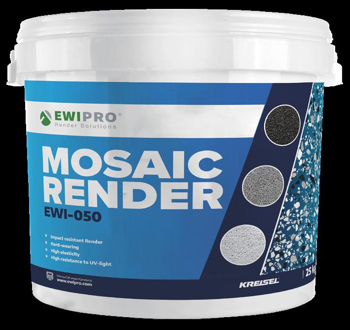Mosaic Render is a ready to use decorative render It consists of coloured quartz aggregate held within a transparent acrylic resin binder This render is highly durable, making it ideal for exposed surfaces prone to damage and soiling (for example the DPC area) Another key advantage of EWI-050 is how easy it is to maintain. The finished render façade can be scrubbed and cleaned without discolouration or loss of mechanical durability