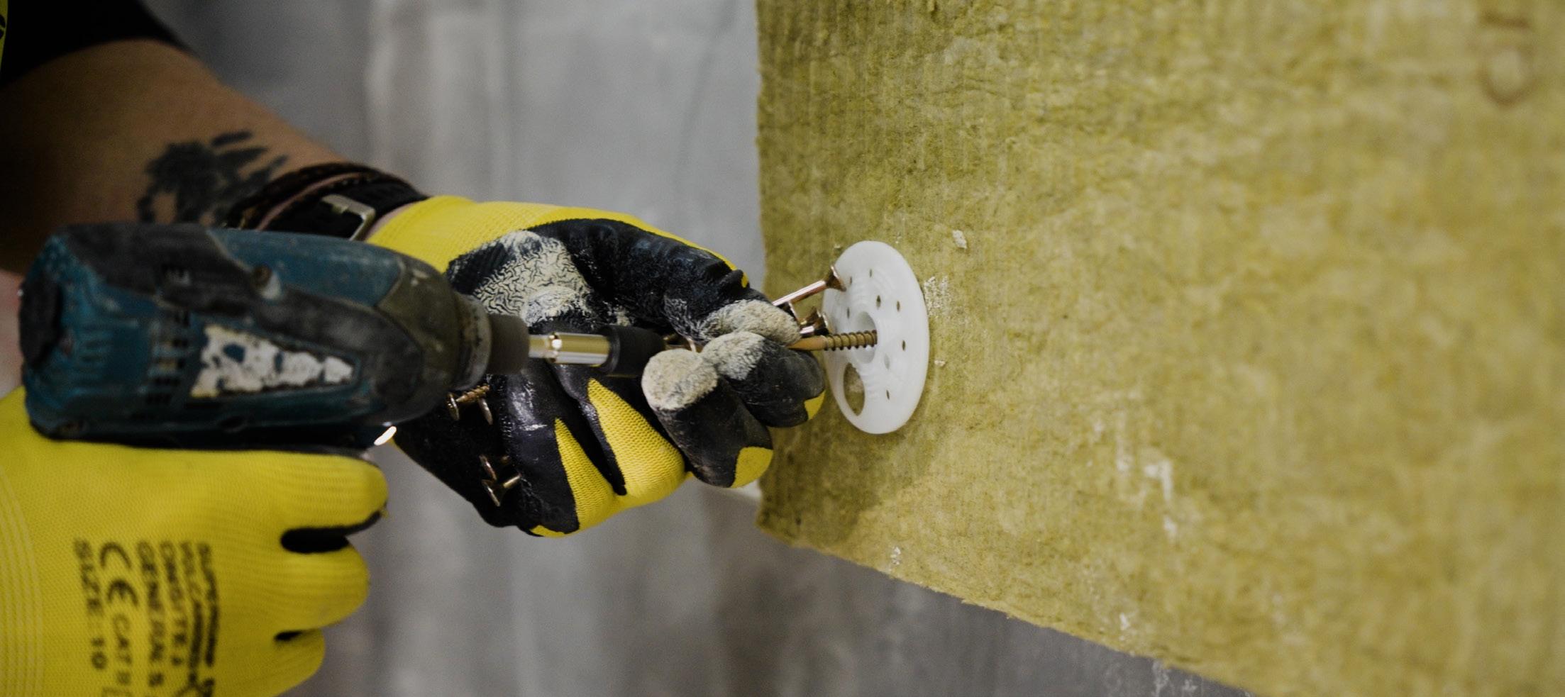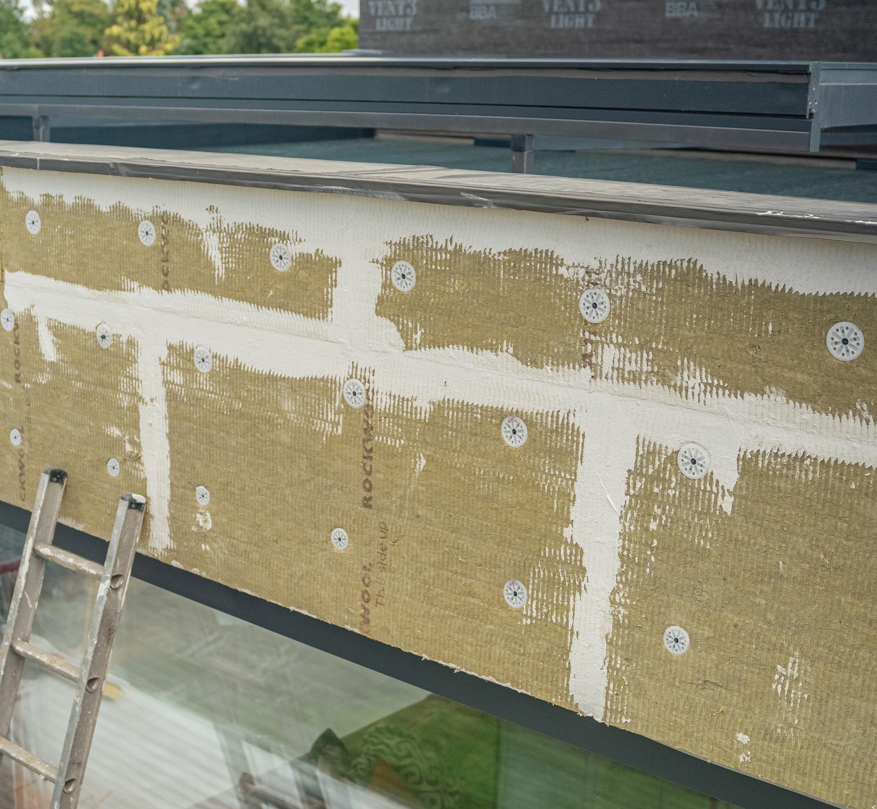 In order to have robust pull-out values and to “fireproof” the system we would install additional fire fixings with metal washers into the steel frame. The fixings should be installed on the same day the basecoat layer has been applied – this is so that the fixings can successfully penetrate through the system and it embeds into the layer.