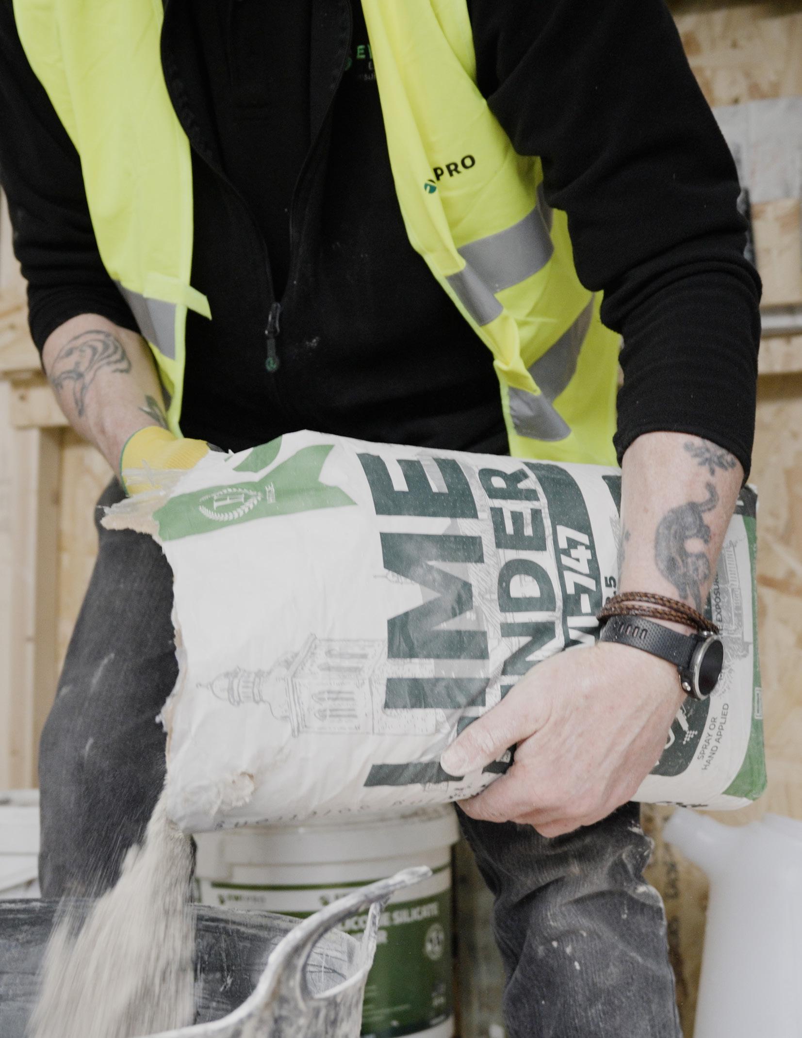 Pour the dry mix into water, maintaining the proportion of 6 5 litres of water per 25kg of dry mix; then mix thoroughly with a mixer to produce a consistent texture Leave for 5 minutes and then mix again before the product is ready for application