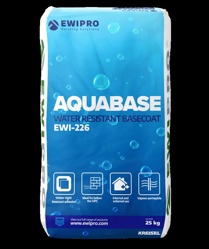 Aquabase is a highly water-resistant, vapour-permeable basecoat adhesive, ideal for application in areas that are prone to water ingress Aquabase actively repels water and creates a stable and smooth surface for plastering works; it can be used with an embedded Fibreglass Mesh to enhance the overall tensile strength of the system; as such, it is often used below the DPC With its complete water resistance, the product will ensure a completely smooth, durable basecoat