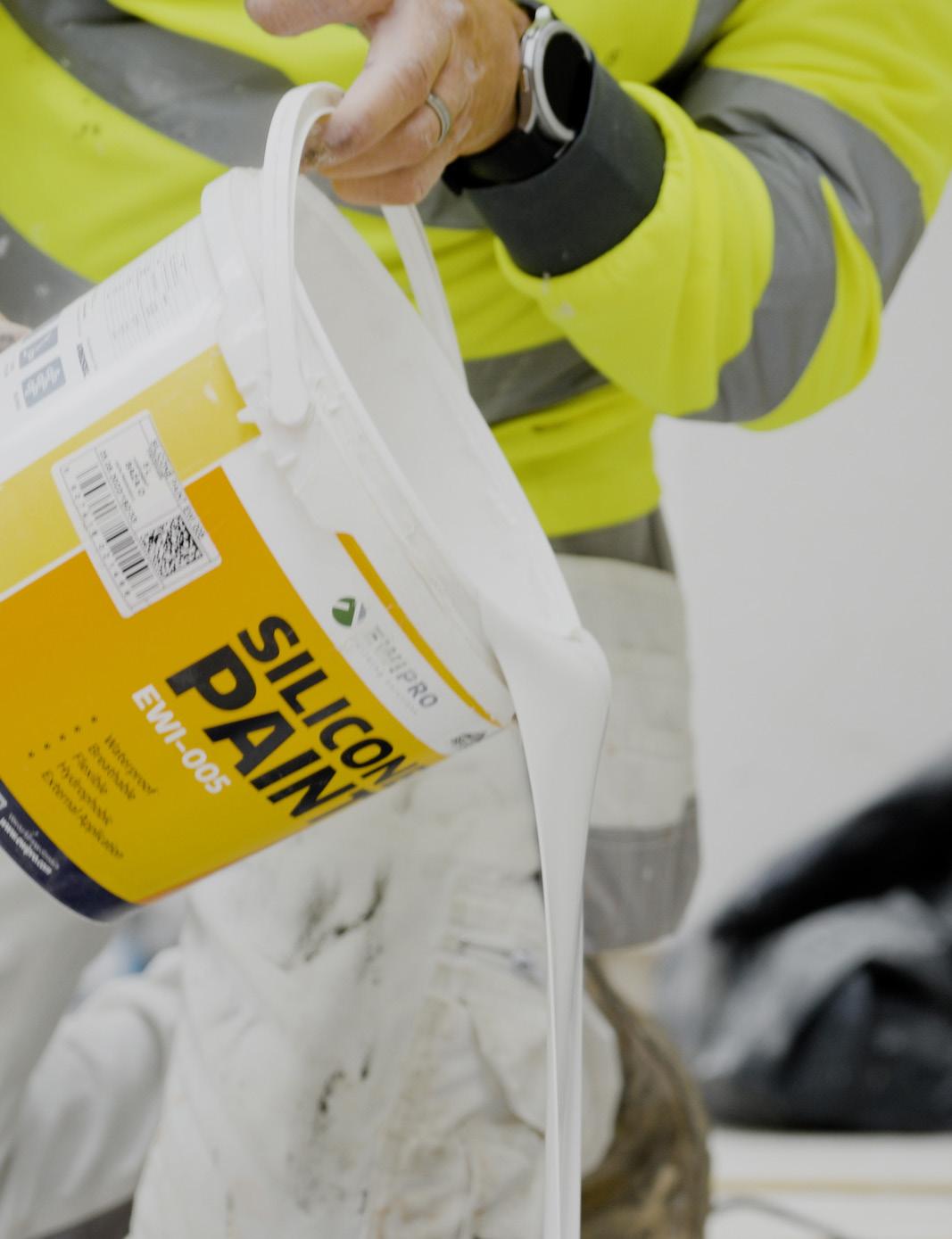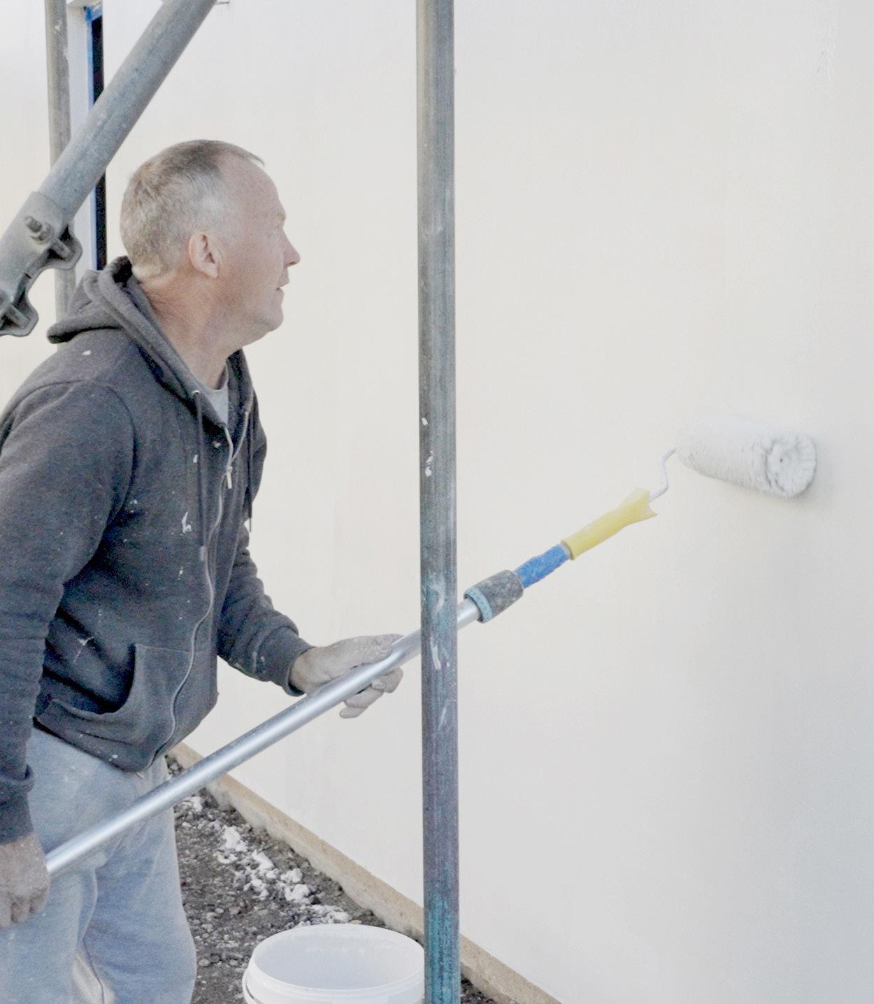 Silicone Paint is crucial to seal in the Mineral Render, giving it frost-proof and hydrophobic qualities The surface will also be resistant to algae and plant growth Check that the paint is the requested colour Mix paint thoroughly in the container When using more than one tin of paint for the same surface, ensure that the batch numbers are matched Apply using brushes, rollers or spray equipment Paint one surface continuously before moving onto the next surface – do not allow any parts of the painted surface to dry out in the process to avoid visible lines Depending on weather conditions, the product should be applied after 3-7 days, and at the latest 21 days after rendering In case of multi-layer render coats, the last layer must be 7 days old, although a single layer is usually sufficient. Painting works must not be carried out during rain or snow, strong winds or direct sunlight without special shields to limit exposure to weather conditions Paint coat drying time is 2-3 hours at a temperature of +20°C and about 65% relative humidity Subsequent paint coats can be applied after 12 hours This period can be longer in low temperatures and high relative humidity, e g in autumn If the paint is still wet, falling mist can have the same effects as drizzle and may cause water stains and colour changes Paints with intense vibrant colours (reflection coefficient Y < 20%) should not be used for large façades; the resulting temperature and UV radiation in these conditions may reduce paint coat durability and cause colour fading