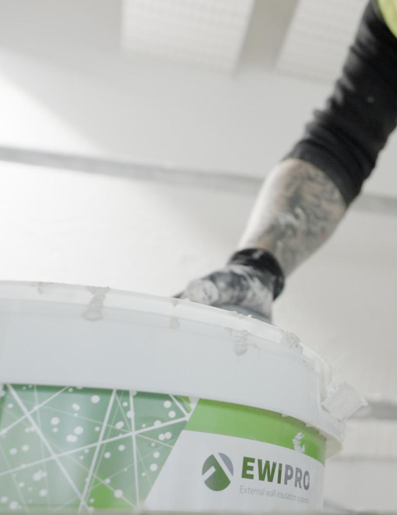 The basecoat on top of the render carrier board is embedded with fibreglass mesh to provide a reinforcing layer designed to prevent cracks. Per the architects’ specification, the EWl-076 Premium Bio Silicone decorative topcoat was throughcoloured RAL9016 Traffic White; the EWl-333 topcoat primer was tinted the same colour to ensure full consistency across the completed facade What’s more, not only can the Premium Bio Silicone render withstand additional forces such as wind and water driven in from off-sure in high exposure zones, but it also has slow-releasing anti-fungal agents which will maintain the façade’s fresh appearance