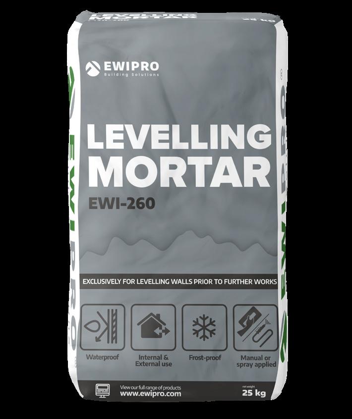 EWI-260 Levelling Mortar is used on walls as a scratch coat or to prepare an uneven substrate prior to applying render for EWI Pro solid wall insulation systems. The product is a polymer-modified sand and cement mixture, which can be used for repairing and filling cavities in walls. Our EWI-260 Levelling Mortar can be used to fill and repair holes and other imperfections up to a maximum thickness of 50mm, and the mortar can be applied on various different walls and substrates, including concrete as well as different types of block or brickwork