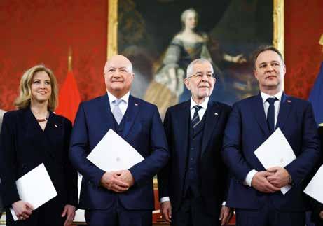 Bundespräsident Alexander Van der Bellen bei der Angelobung in der Präsidentschaftskanzlei mit Bundeskanzler Christian Stocker, Vizekanzler Andreas Babler und Bundesministerin Beate Meinl-Reisinger.