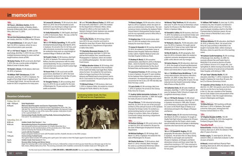 ’70 s ’78 Timothy Mutch, 58, BA biology, died in June 2010. He was a teacher and coach in Nevada for more than 20 years. Most recently he worked for the U.S. Department of Agriculture in Idaho Falls, Idaho. ’77 Charlotte (Rousseau) Greene, 84, BA applied psychology, died April 15, 2010. She and her first husband, Tom, owned Rousseau Photographers in Spokane, where she worked as a wedding photographer. She later married Frank Greene. ’77 William Brasher Schorr, 60, BS biology, died Feb. 13, 2010, in an avalanche in the mountains of the South Fork Valley near Eagle River, Alaska, where he lived. He worked for Fish and Game, before he began teaching in the Anchorage, Iditarod and Pribilof Island school districts and in the St. Croix islands. For the past 20 years, he was a custom woodworker. ’75 Michael Schaar, 57, BA business, died June 2, 2010, in Spokane Valley. He worked as a branch manager for Pacific Metal Co. for 33 years. Celebrating Golden Grads, the Class of 1960 and Service Organizations