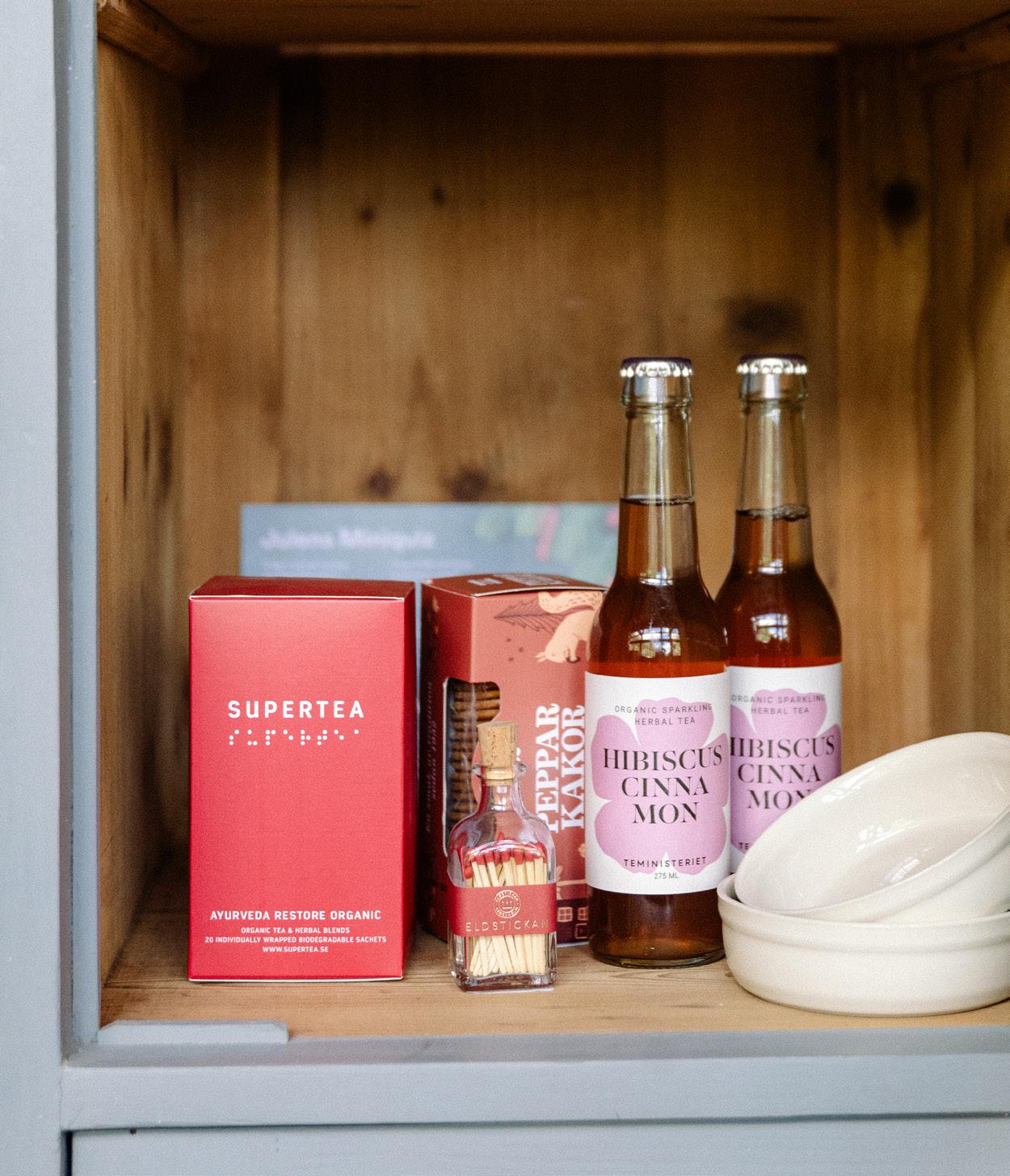 Innehåller: Sparkling tea från teministeriet med smak av hibiskus och kanel | Pepparkakor från Nyåkers | Supertea från Teministeriet ”Ayuvreda restore” | 2 st creme bruleé formar från Emile Henry 12 cm ø | Röda tändstickor från Eldstickan | Julquiz med möjlighet att profilera på baksidan