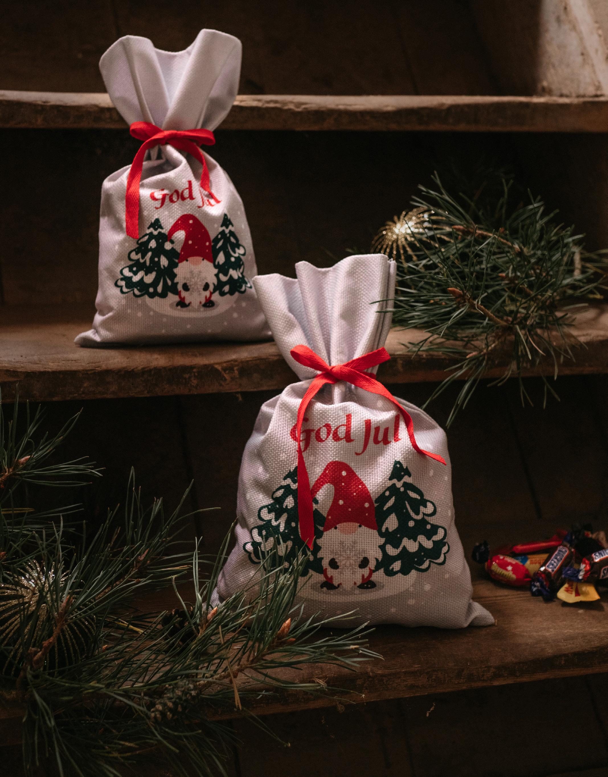 Designen på Årets Julsäck 2023 från Exakta går i ljusgrått med ett inbjudande egendesignat julmotiv som förmedlar önskan om en riktigt God Jul till sin mottagare.
