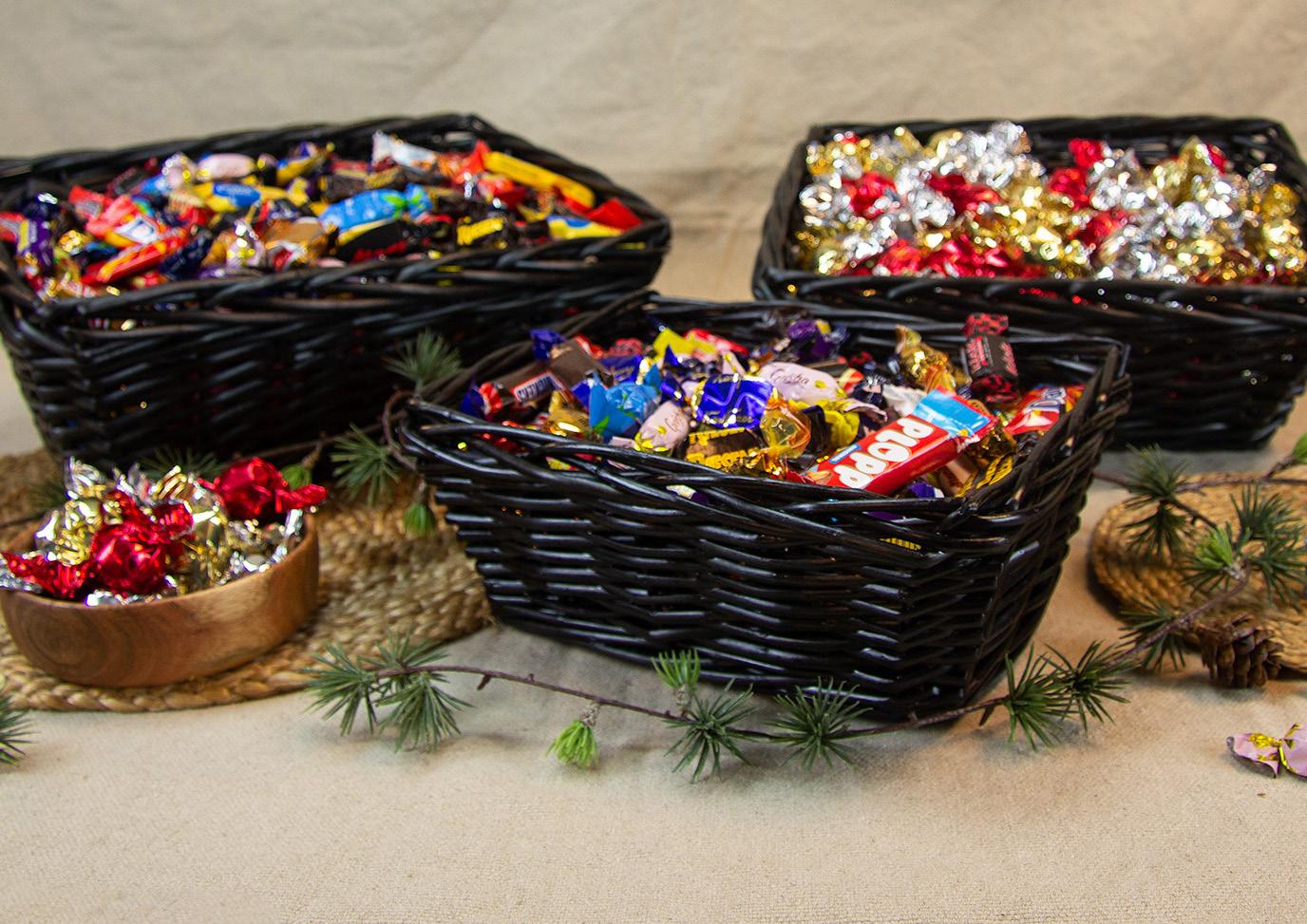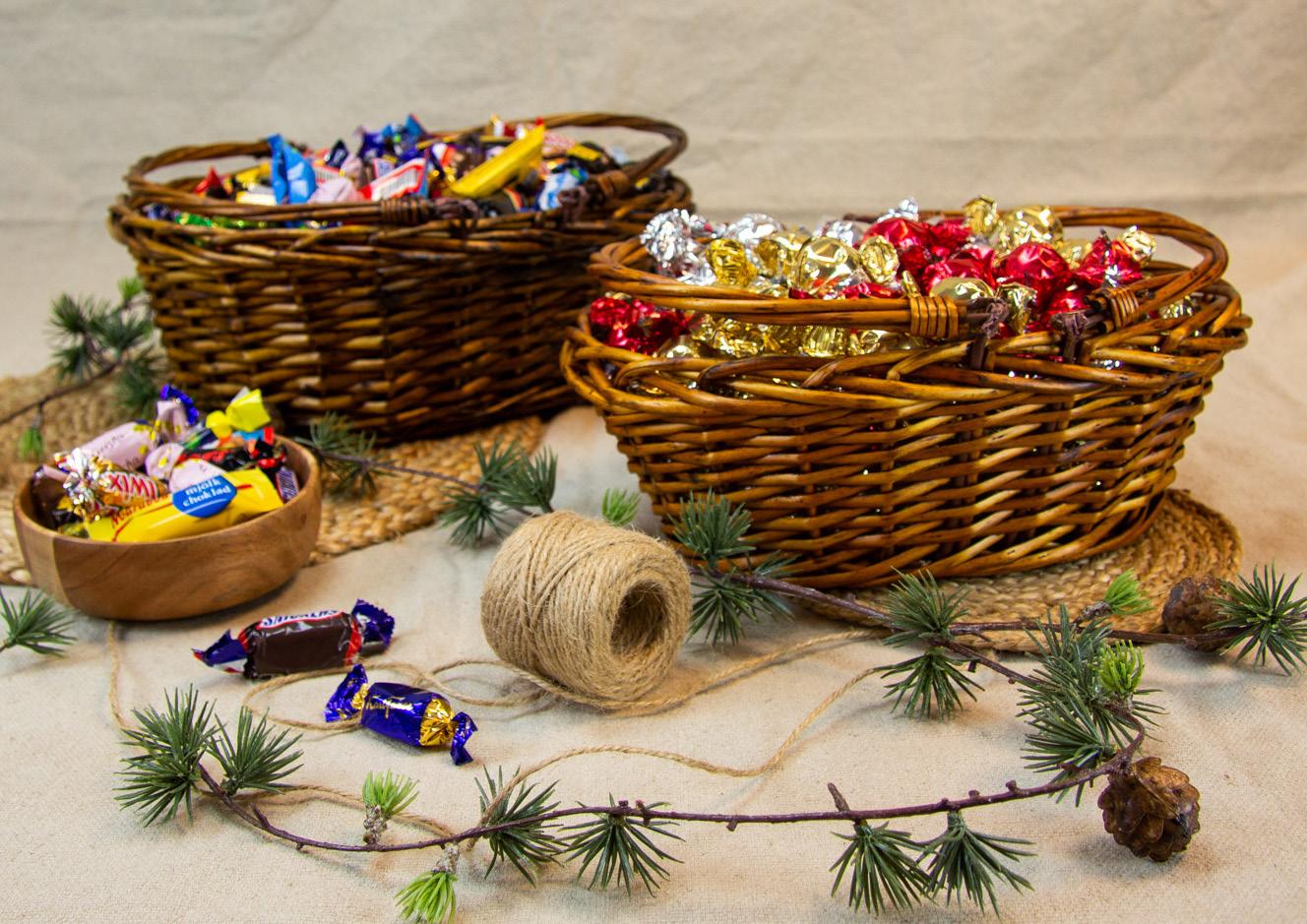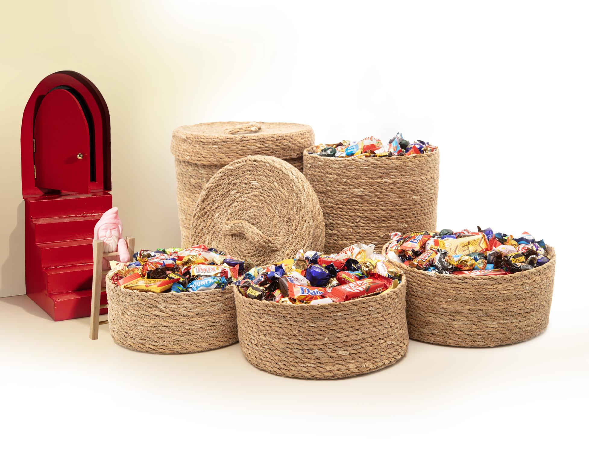 Julkorgar tillverkade av ett invasivt sjögräs som är ett vackert och hållbart material. Varje korg försluts i vackert cellofan med en röd rosett.