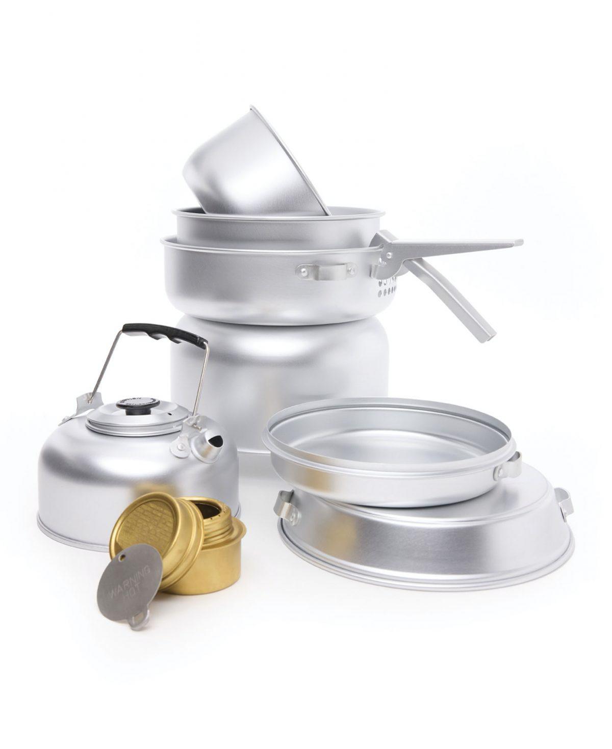 Innehåller: Vindskydd | Stativ för gryta och stekpanna | Kastrull 1 liter | Kastrull 1,2 liter | Stekpanna med lock 18 cm | Stekpanna med lock 22 | Kaffekanna | Kaffesil | Griptång | Spritbrännare