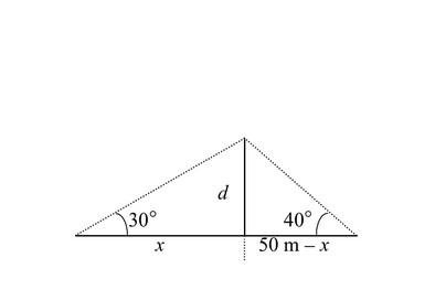 105. d = x tan 30 = (50 m x) tan 40 = (50 m) tan 40 x tan 40 x = = 29.6 m. So d = (29.6 m) tan 30 = .