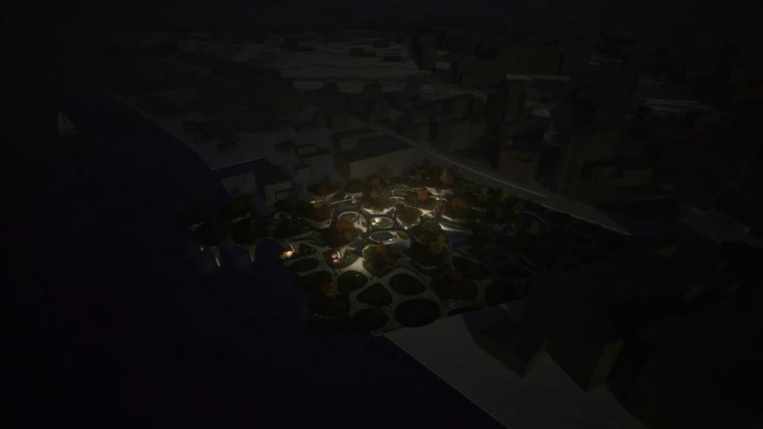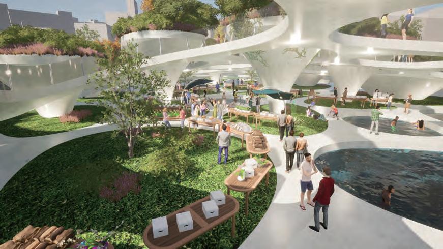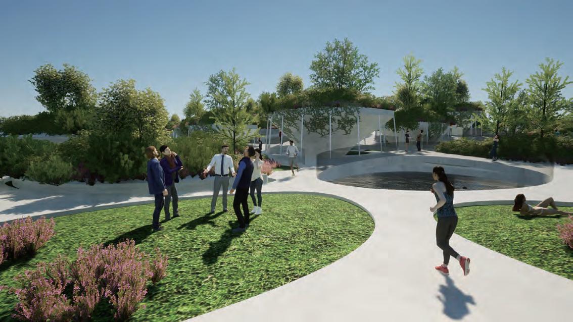 The top layer is used as a park, providing spaces for visitors and residents to engage in activities and rest.