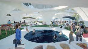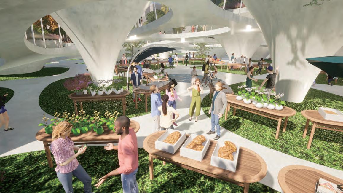 The middle layer is primarily for market and service functions, including information booths, restrooms, offices, and mechanical and electrical