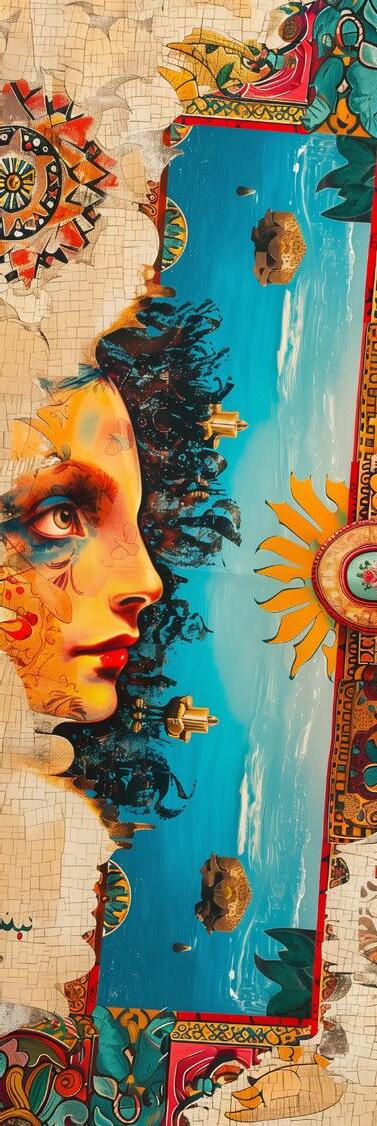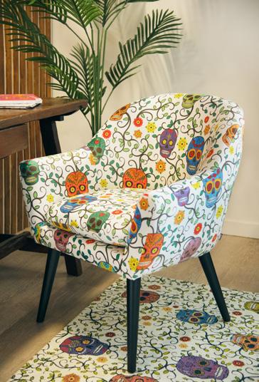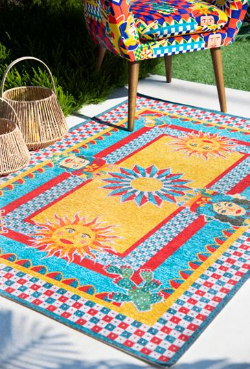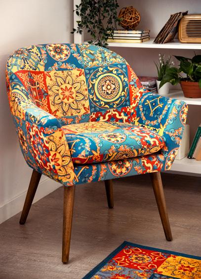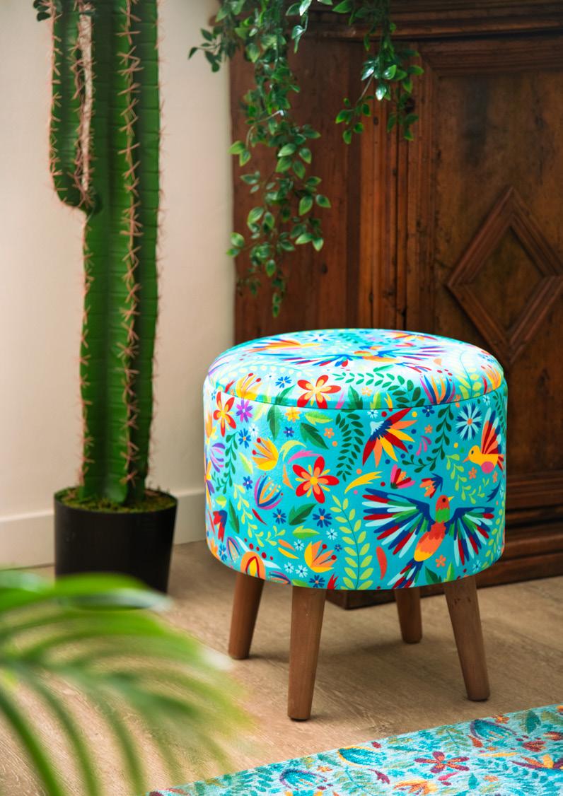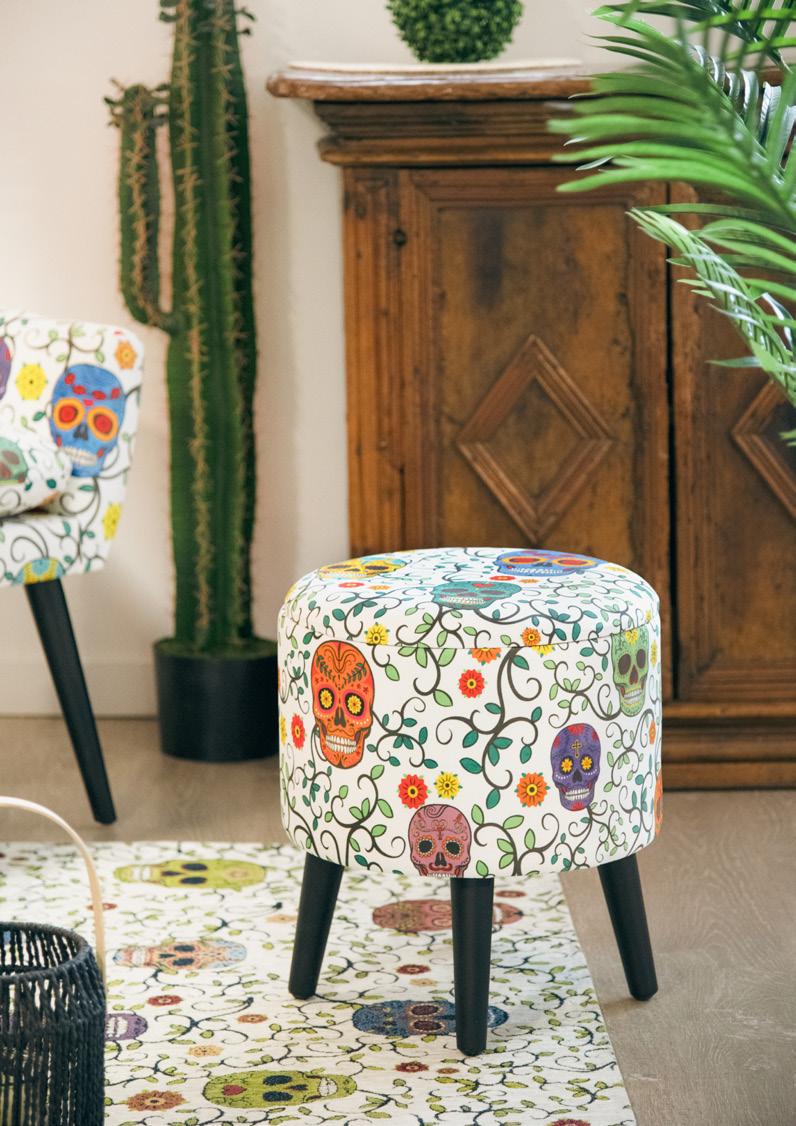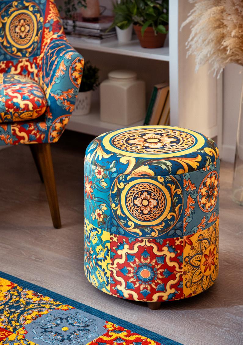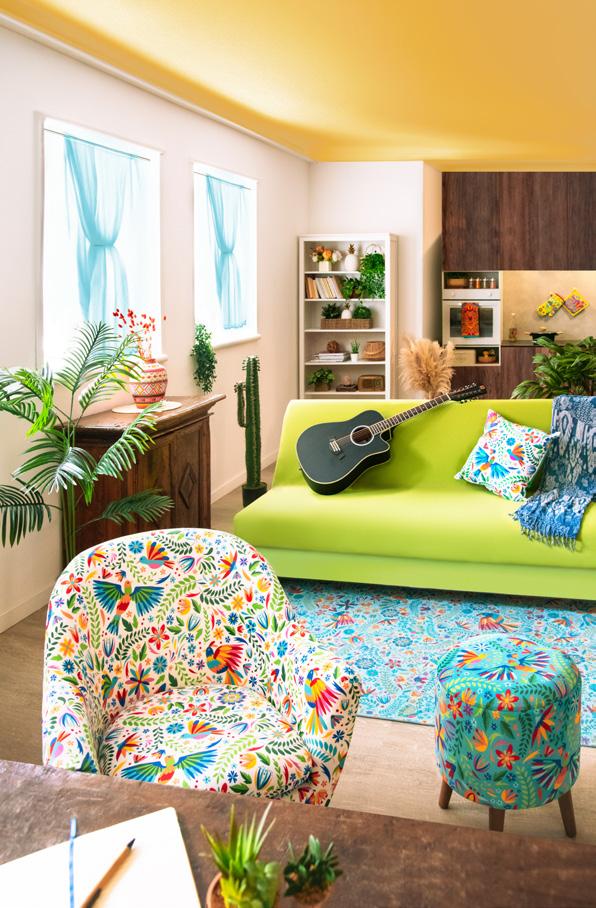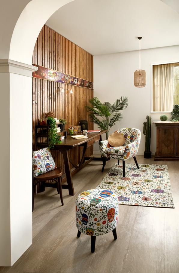 In questo soggiorno luminoso e accogliente, i motivi decorativi di poltrona, pouf e tappeto raccontano una storia vibrante, ispirata alla ricca cultura del Messico. Le fantasie intricate e i colori accesi, come il rosso, l’arancione e il turchese, evocano le tradizioni artistiche dei tessuti messicani, in cui ogni disegno è un omaggio alla terra, alla storia ed al folklore. Ogni dettaglio sembra prendere vita, trasformando il soggiorno in un angolo di mondo dove l’anima del Messico risplende in tutta la sua bellezza. Qui, le forme geometriche si intrecciano con motivi floreali e simboli ancestrali, creando un’armonia visiva che invita a esplorare e a lasciarsi ispirare. Questo spazio non è solo un luogo per rilassarsi, ma una celebrazione della cultura e dell’arte messicana, un invito a immergersi in un viaggio sensoriale attraverso il cuore pulsante del Messico.