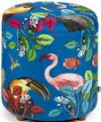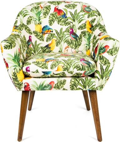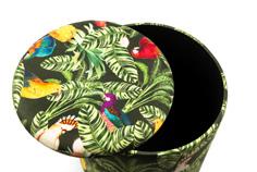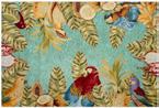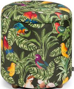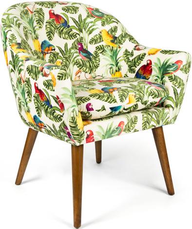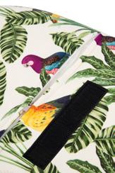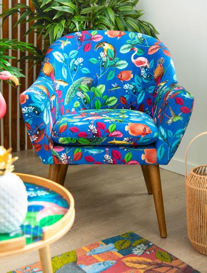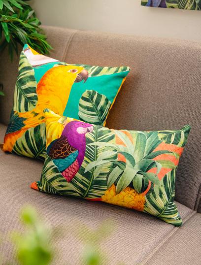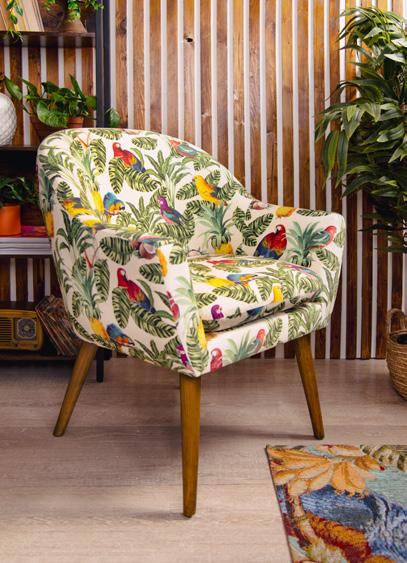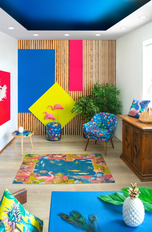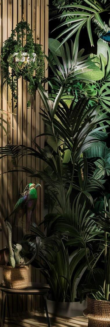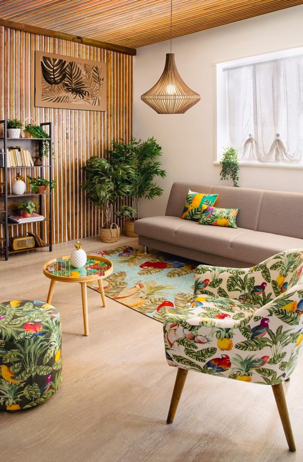 Soggiorno arredato in stile tropicale, dove ogni dettaglio trasmette un’atmosfera di relax e freschezza. Le pareti con listelli di legno e dalle tonalità calde ed accoglienti affiancano ampie finestre, le quali permettono alla luce naturale di illuminare la stanza in maniera diffusa, dove splendidi pappagalli dai mille colori sono il punto focale della collezione. Al centro, una poltrona in velluto di poliestere invita al riposo, accompagnata da un pouf coordinato che offre ulteriore comfort. Sul pavimento, un tappeto dai motivi esotici ed imponenti pappagalli colorati aggiunge un tocco di colore e vivacità, richiamando le sfumature della natura tropicale. Cuscini decorati con stampe di foglie ed elementi tropicali completano l’ambiente, creando un angolo perfetto per rilassarsi e sognare paradisi lontani.